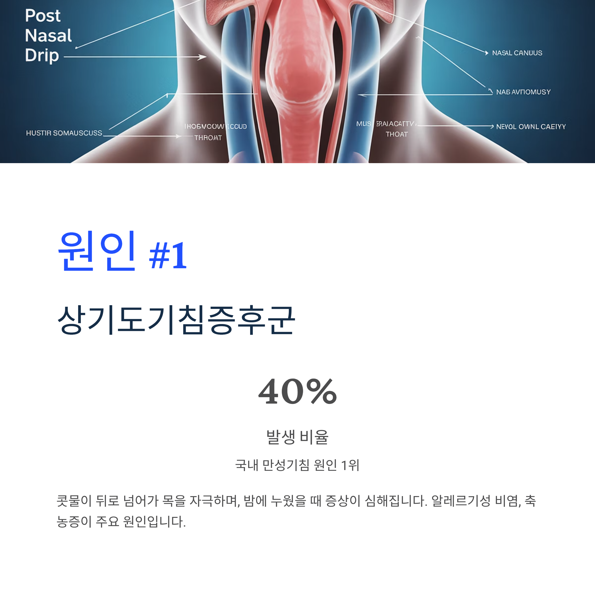 상기도기침증후군은 대한민국 만성기침 원인 중 40%를 기록할 정도로 가장 흔한 질환입니다. 콧물이 뒤로 넘어가 목을 자극하면서 기침을 유발하며, 주로 밤에 누웠을 때 증상이 심해집니다. 알레르기성 비염, 부비동염(축농증), 비인후염이 주요 원인입니다.