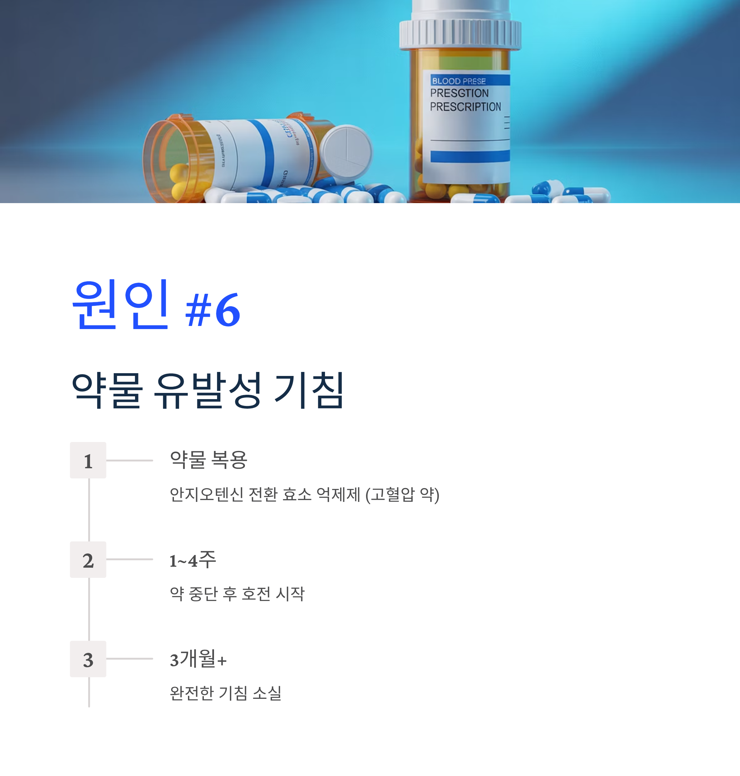 고혈압과 같은 심장질환 환자는 안지오텐신 전환 효소 억제제를 투약해 약제 유발성 기침이 발생할 수 있습니다. 약을 중단하고 1~4주 이내에 호전된다고 알려져 있고, 완전히 기침이 소실되는 데에 3개월 이상 걸리기도 합니다.