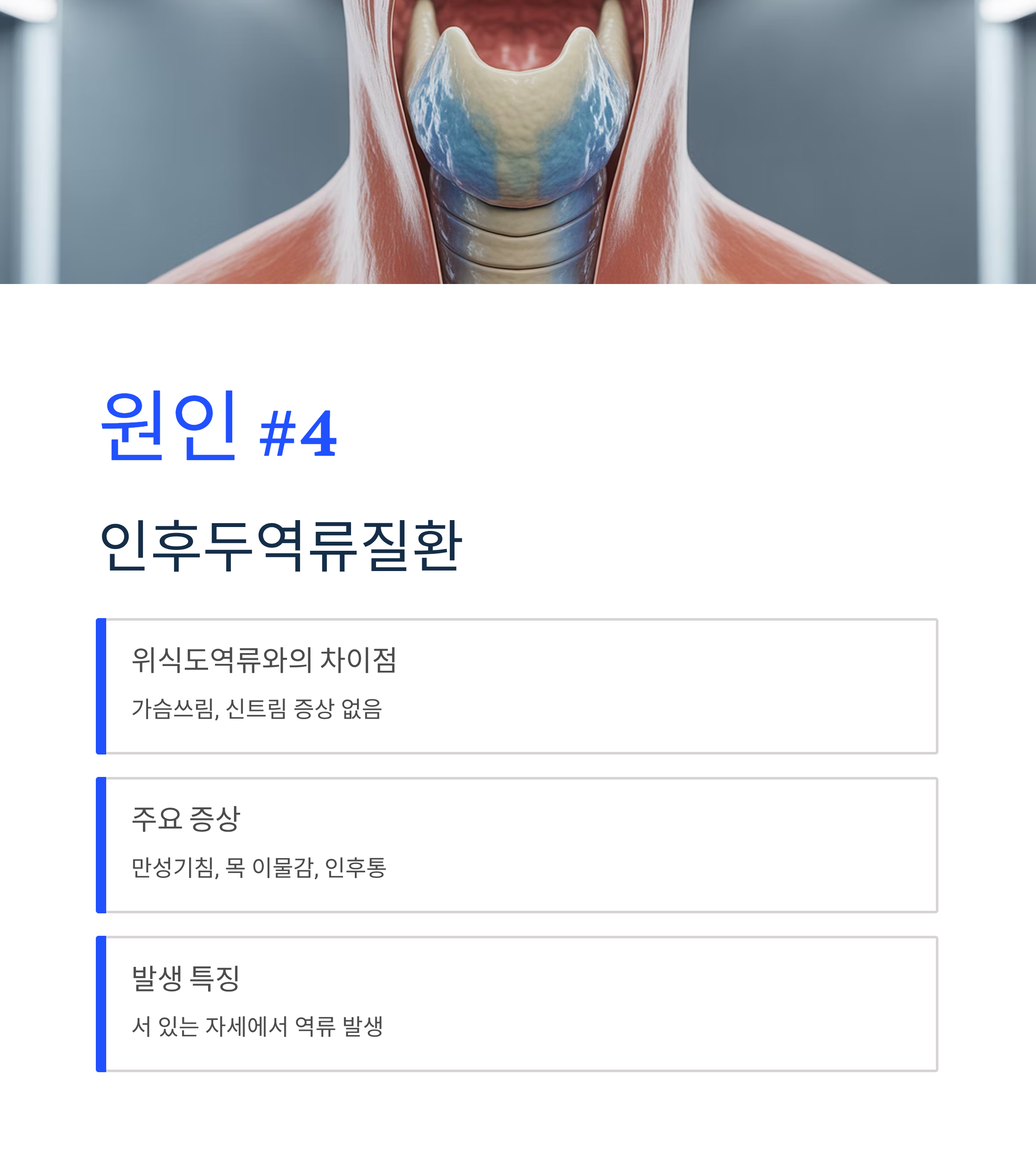 인후두역류질환은 위산이 후두와 인두로 역류해 점막에 손상과 변화를 일으키는 질환입니다. 위식도역류질환과 달리 가슴쓰림, 신트림 증상 없이 만성기침과 목 이물감, 인후통 등이 주로 나타나며 서 있는 자세에서 역류가 발생합니다.