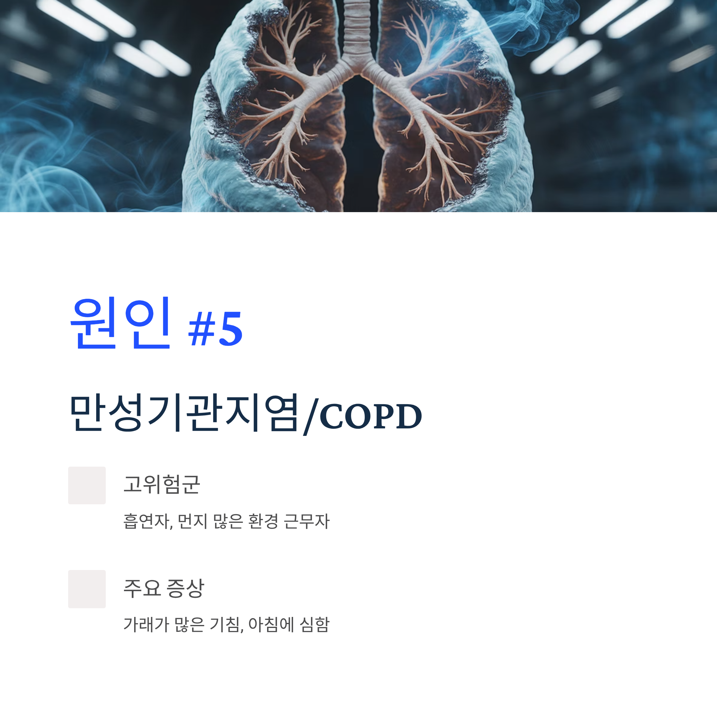 만성 기관지염은 담배를 많이 피우거나 먼지가 많은 곳에서 일하는 사람에게 주로 발생하며, 가래가 많은 기침을 하게 됩니다. 만성기관지염이나 만성폐쇄성폐질환은 아침에 기침을 많이 하는 특징이 있습니다.