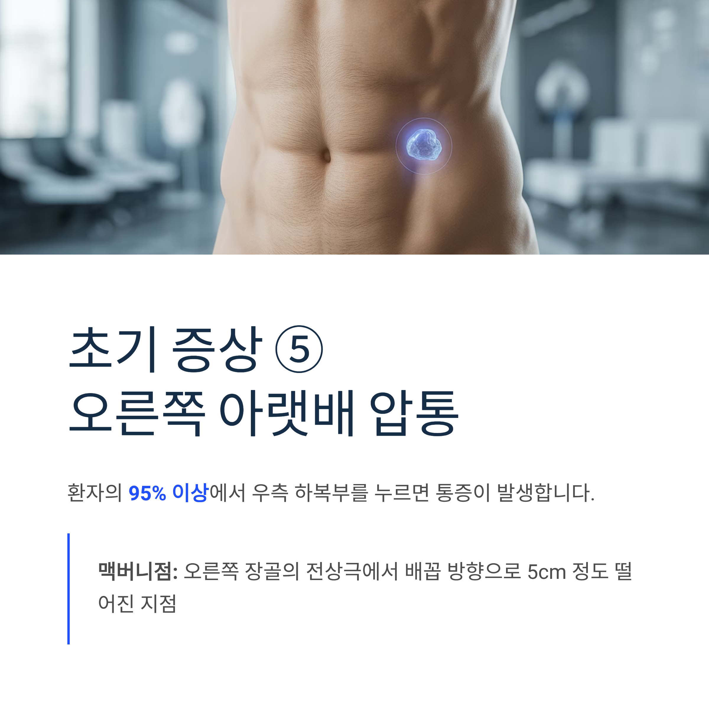 맹장염 환자의 95% 이상에서 우측 하복부(맥버니점)를 누르면 통증이 발생합니다. 이 부위는 오른쪽 장골의 전상극에서 배꼽 방향으로 5cm 정도 떨어진 지점입니다.