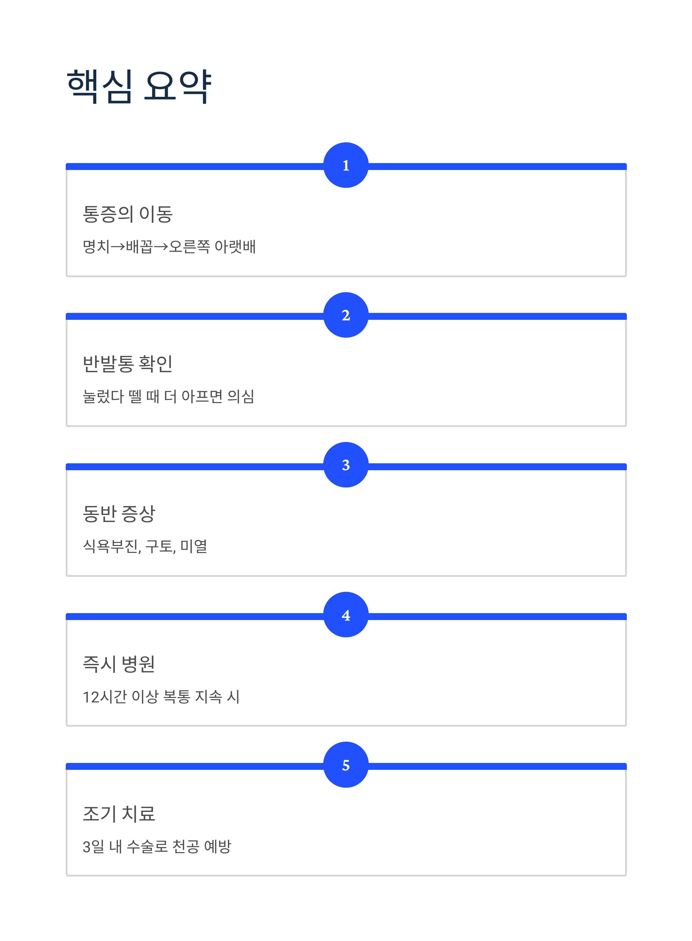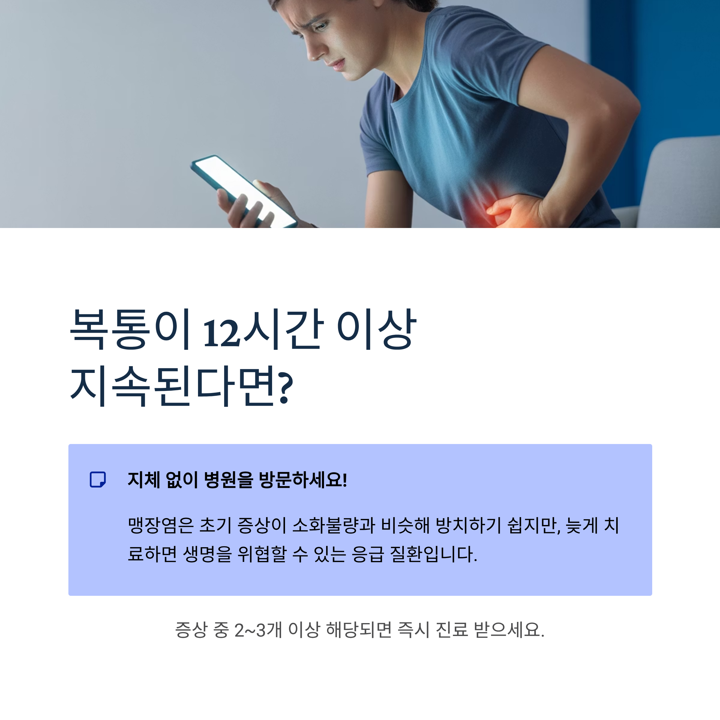 복통이 12시간 이상 지속되거나, 위에서 설명한 증상 중 2~3개 이상 해당된다면 지체 없이 병원을 방문하세요. 특히 반발통이 있다면 맹장염일 가능성이 매우 높으므로 즉시 진료를 받아야 합니다.