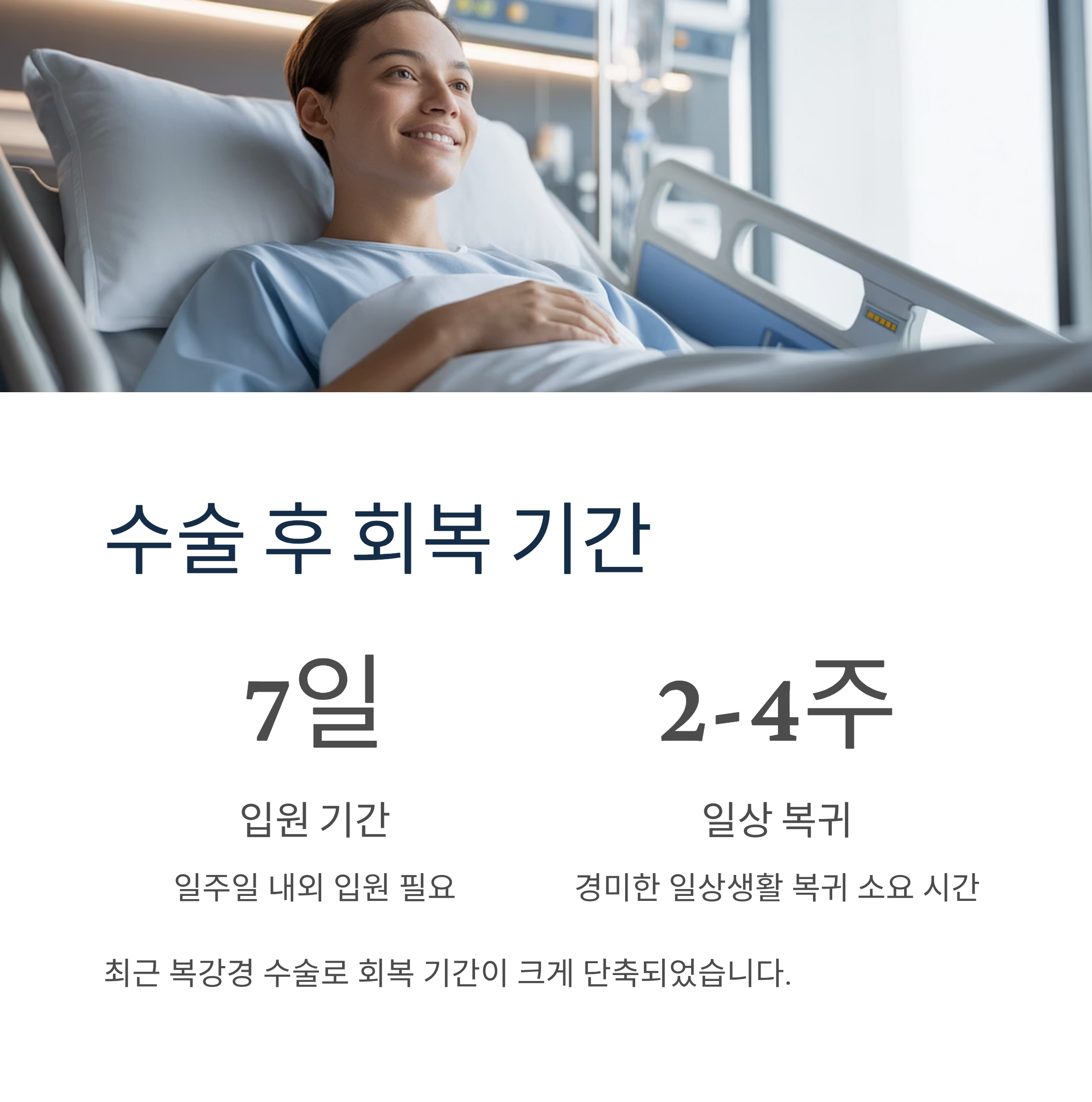 최근에는 흉터가 적고 회복이 빠른 복강경 수술이 주로 이뤄지며, 입원 기간은 일주일 내외, 경미한 일상생활 복귀는 2~4주 정도 소요됩니다.