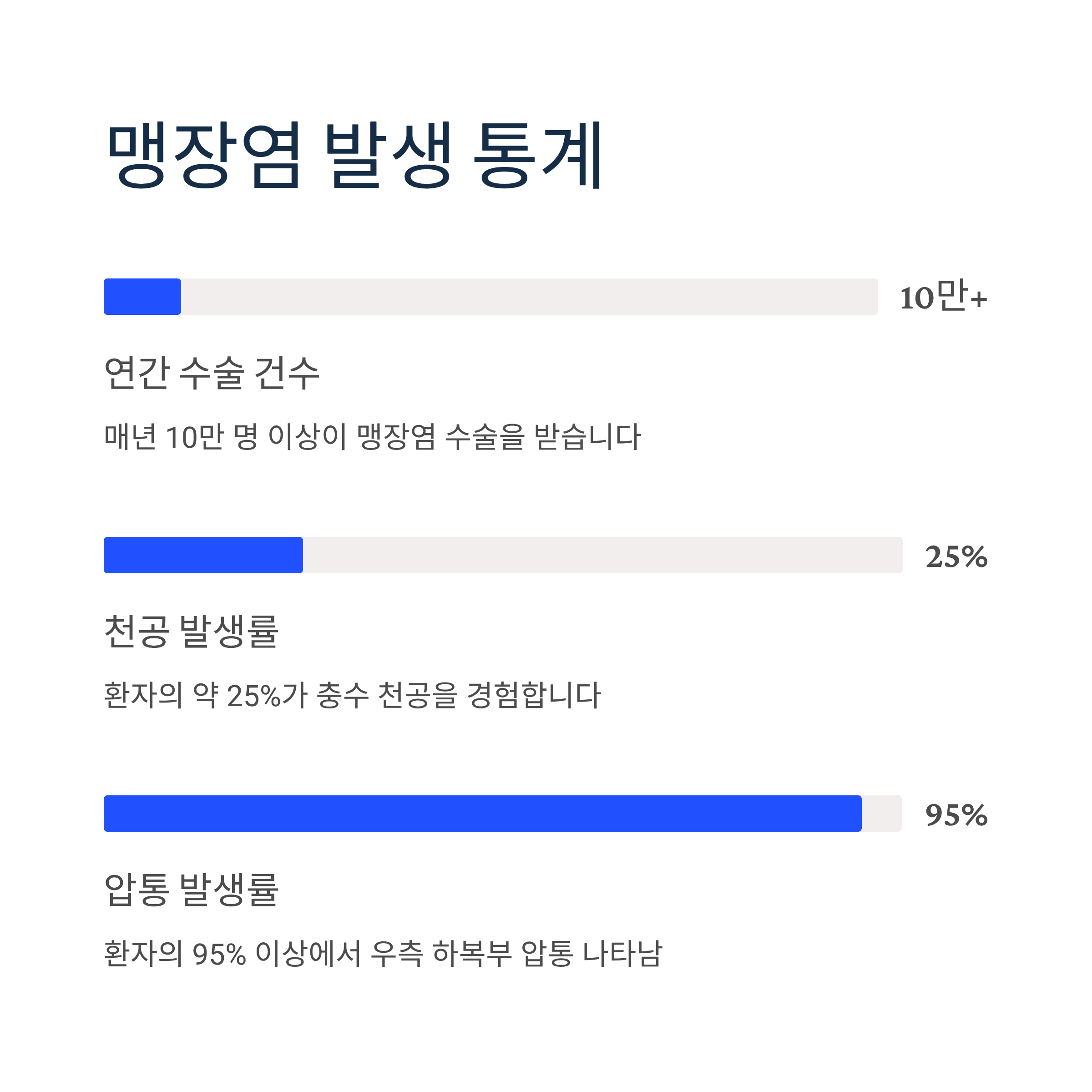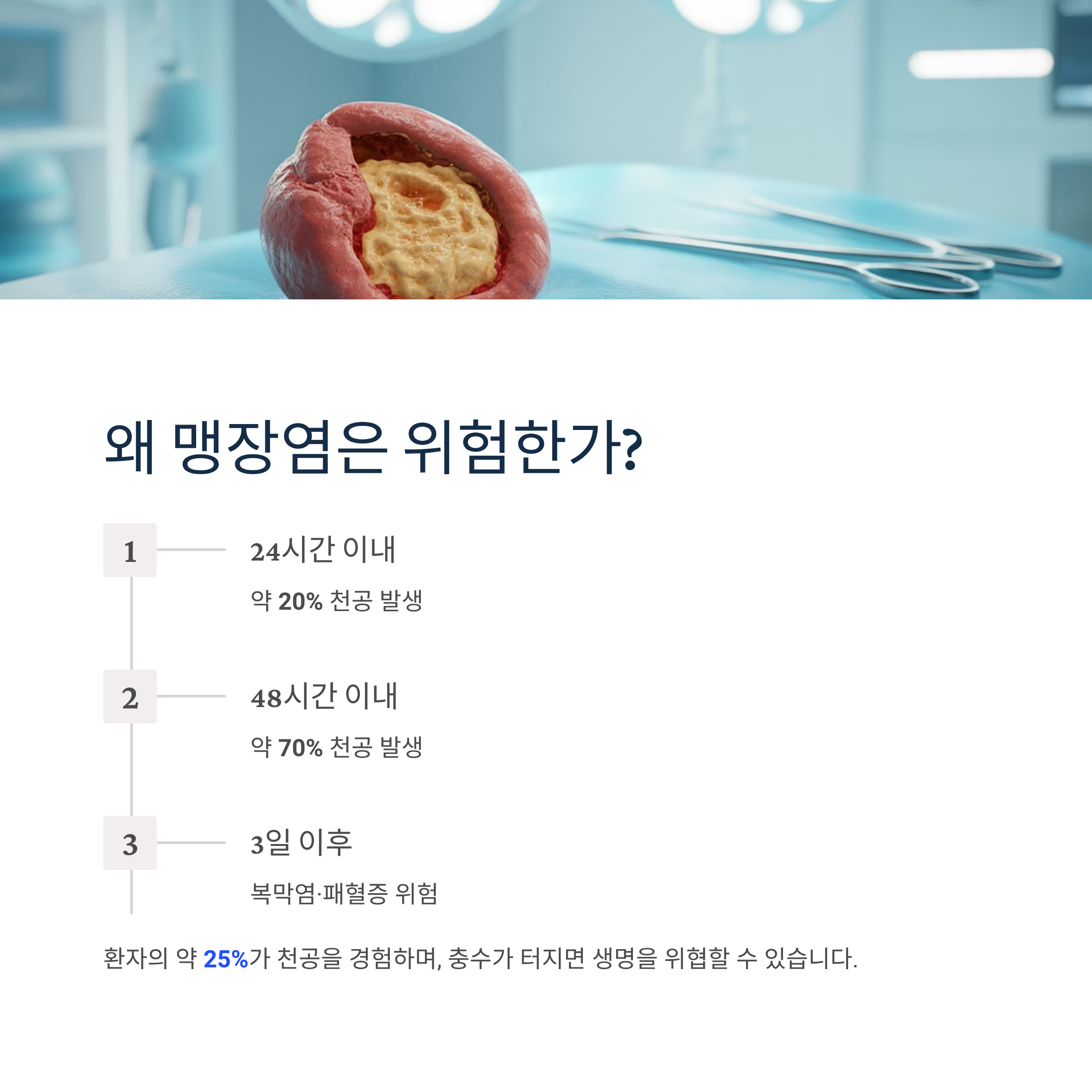 맹장염 증상이 시작된 후 3일 내에 수술을 받지 않으면 충수가 터질 수 있으며, 환자의 약 25%가 천공을 경험합니다. 24시간 이내 약 20%, 48시간 이내 약 70%의 환자에게서 천공이 발생합니다.