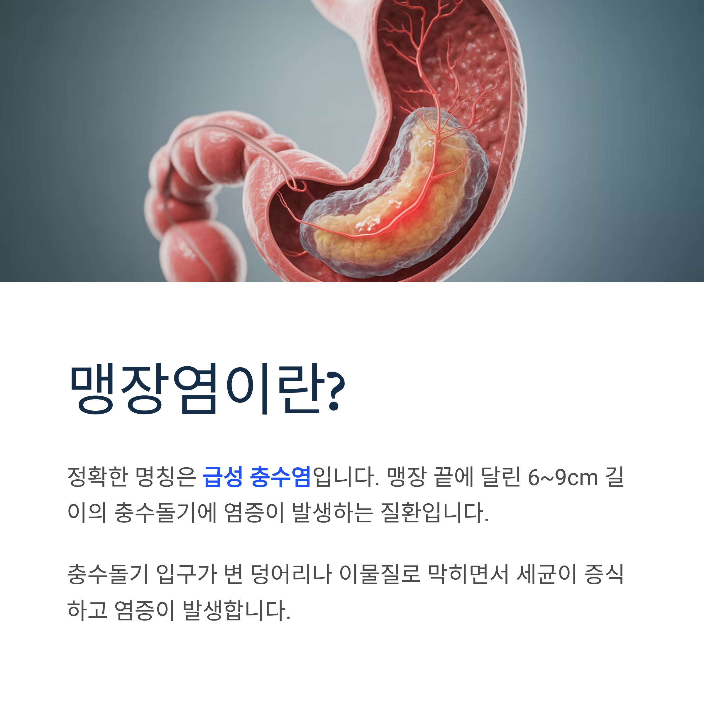 맹장염의 정확한 명칭은 '급성 충수염'입니다. 소장에서 대장으로 이어지는 부위의 맹장 끝에 달린 6~9cm 길이의 충수돌기에 염증이 발생하는 질환을 말합니다.