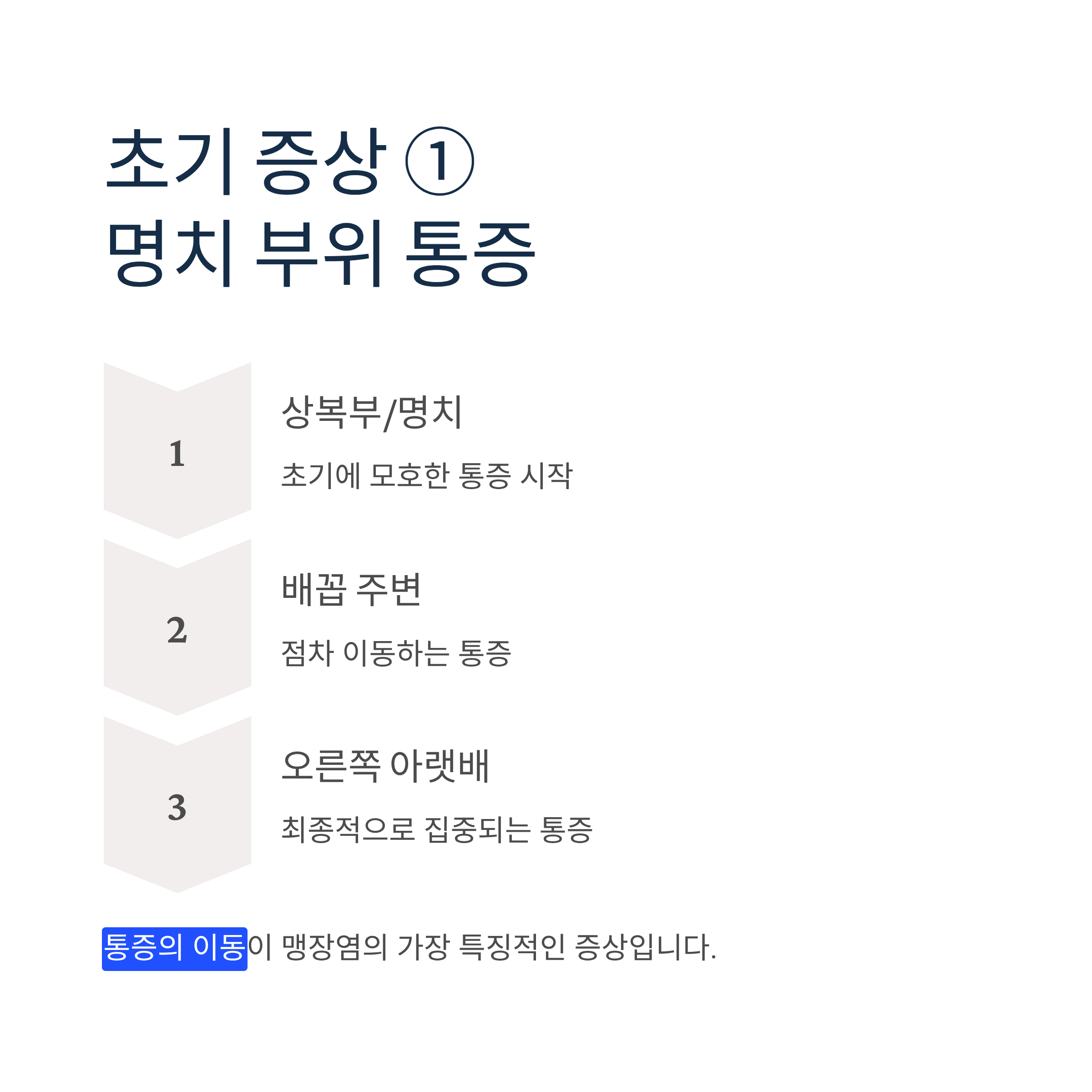 맹장염의 가장 특징적인 증상은 통증의 이동입니다. 초기에는 상복부나 명치 부위에서 모호한 통증이 시작되다가, 점차 배꼽 주변을 거쳐 오른쪽 아랫배로 이동합니다.
