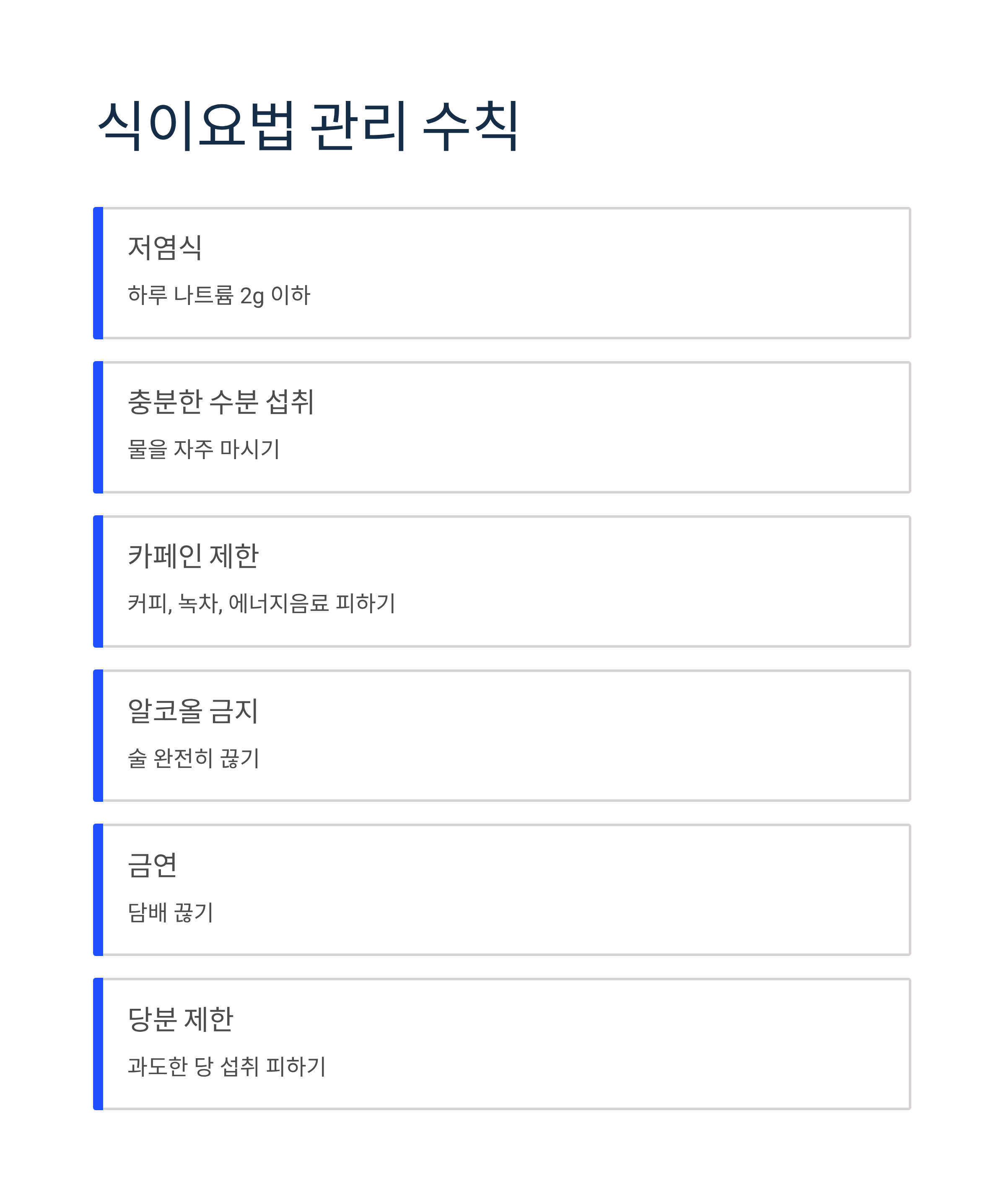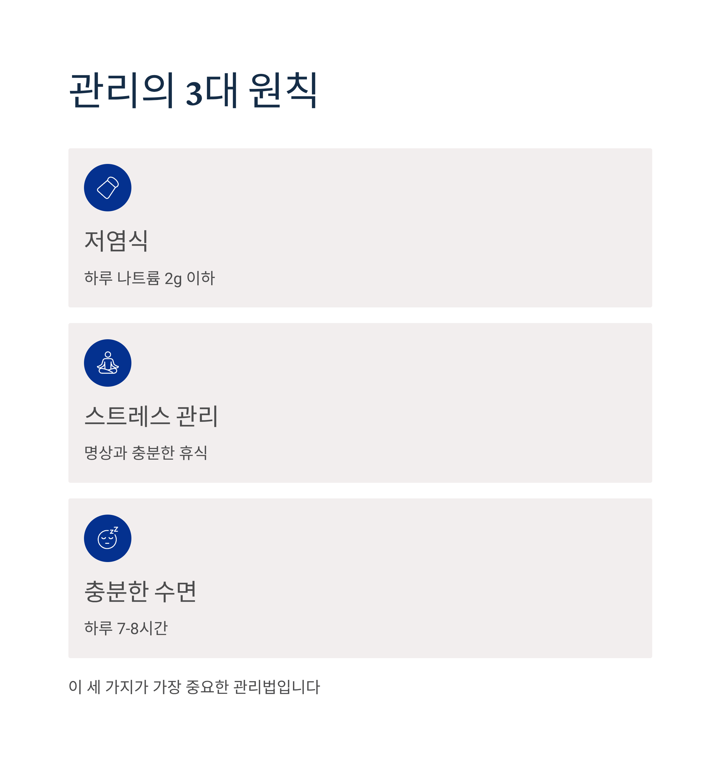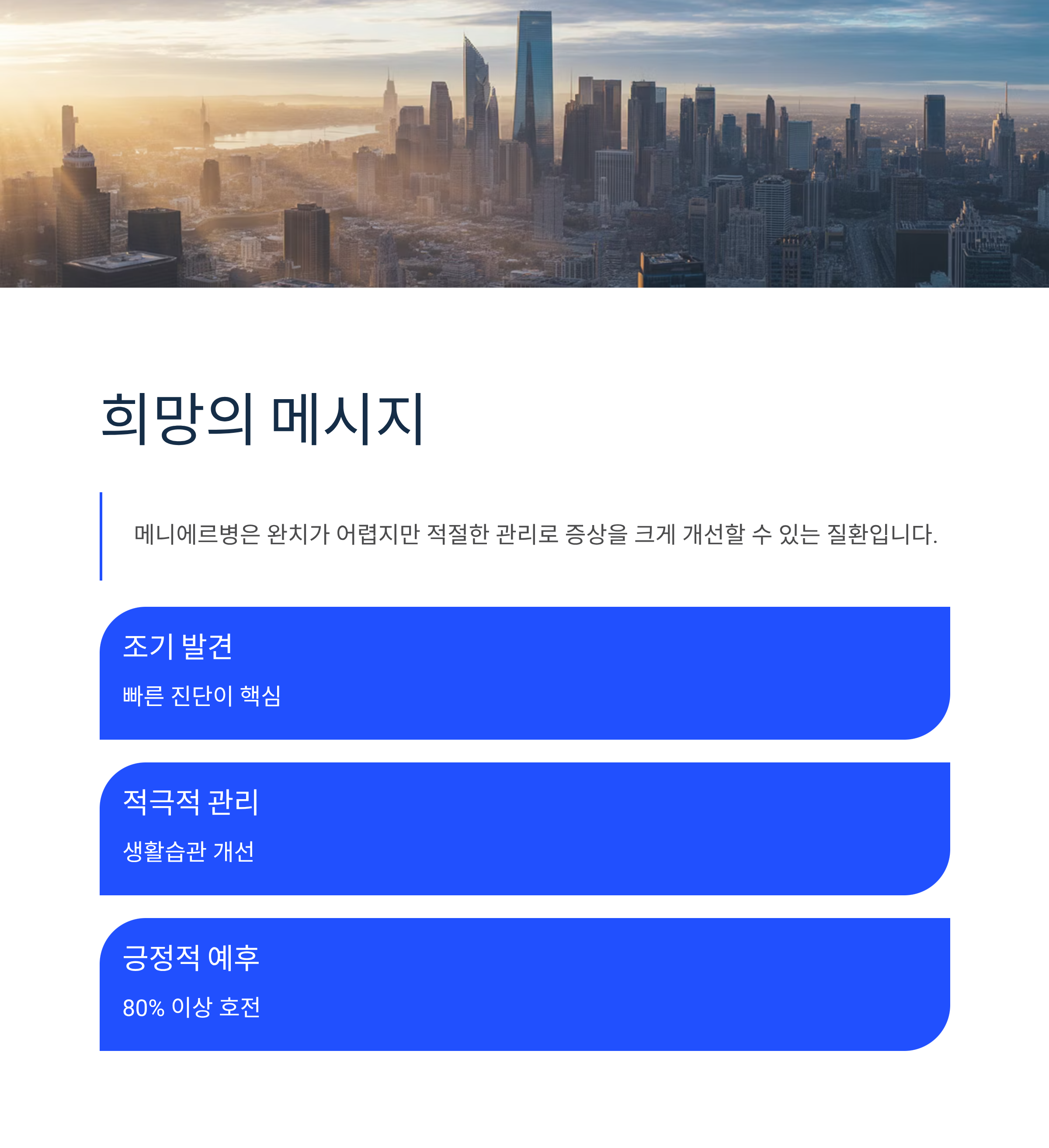 메니에르병은 완치가 어렵지만 적절한 관리로 증상을 크게 개선할 수 있는 질환입니다. 저염식과 스트레스 관리, 충분한 휴식이 가장 중요한 관리법입니다.