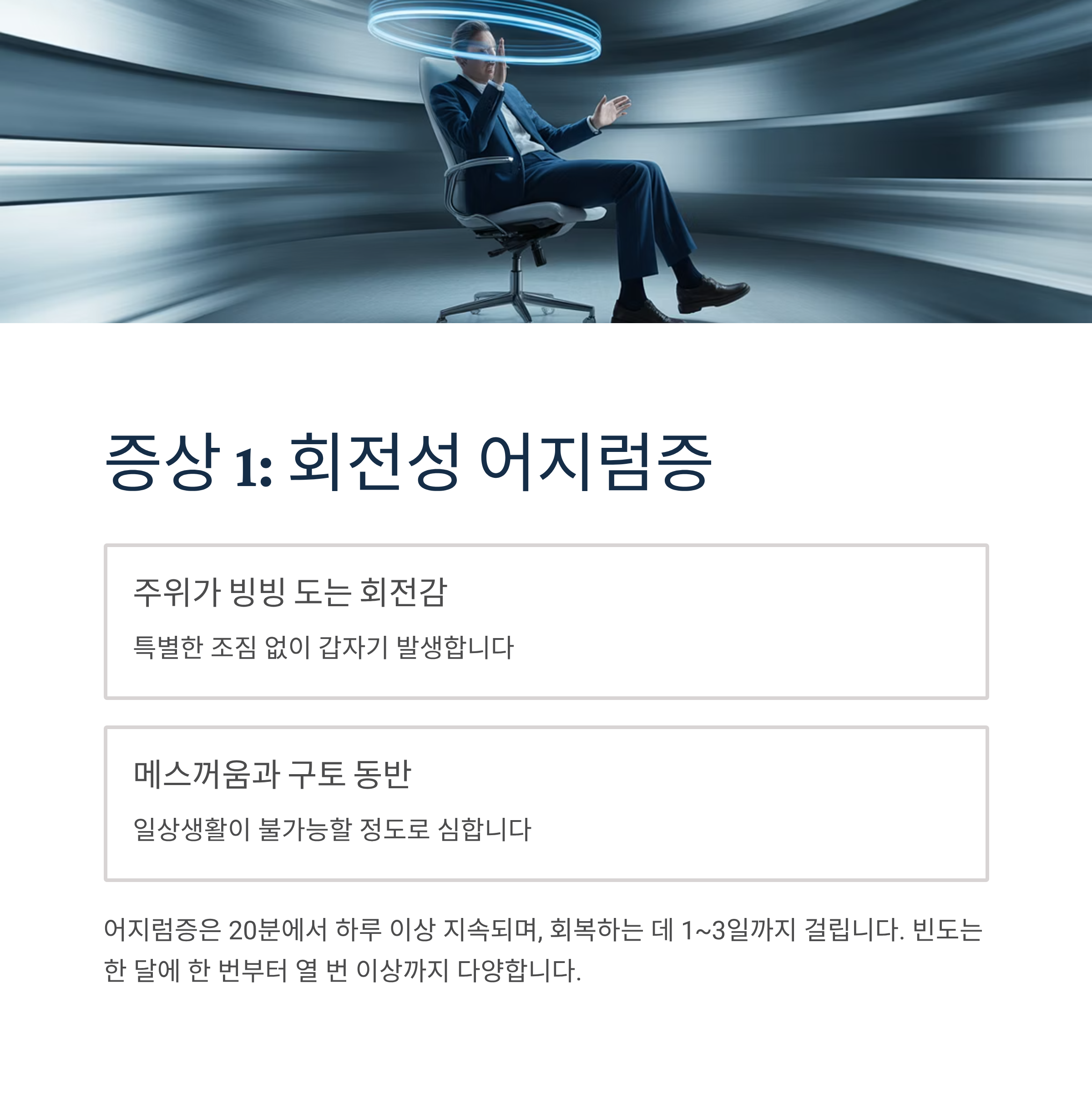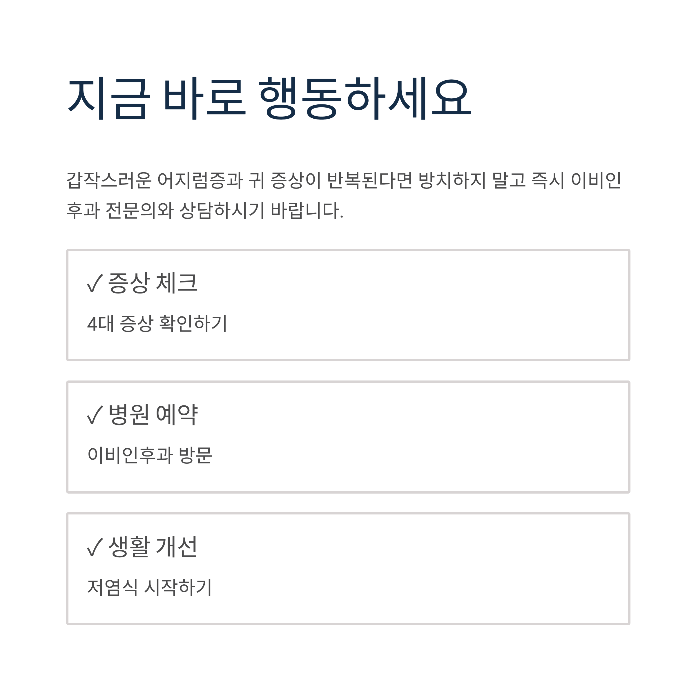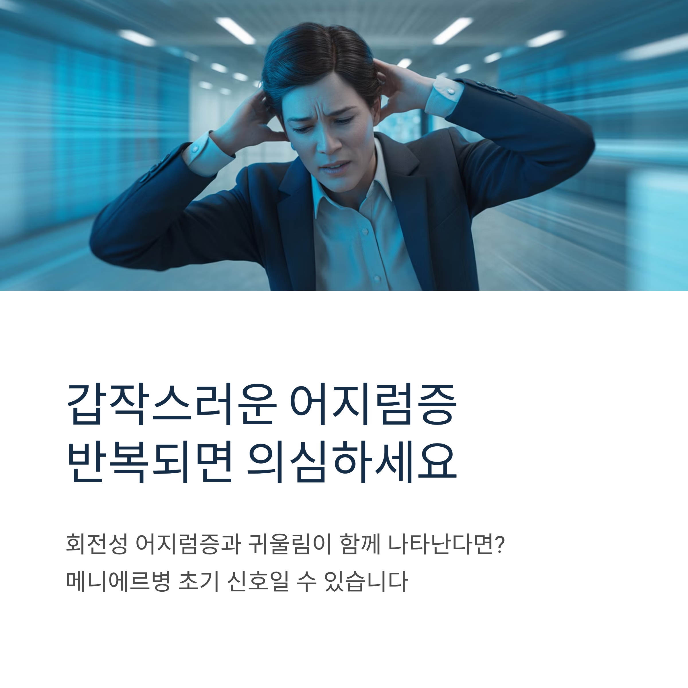 갑작스러운 어지럼증과 귀 증상이 반복된다면 방치하지 말고 즉시 이비인후과 전문의와 상담하시기 바랍니다.