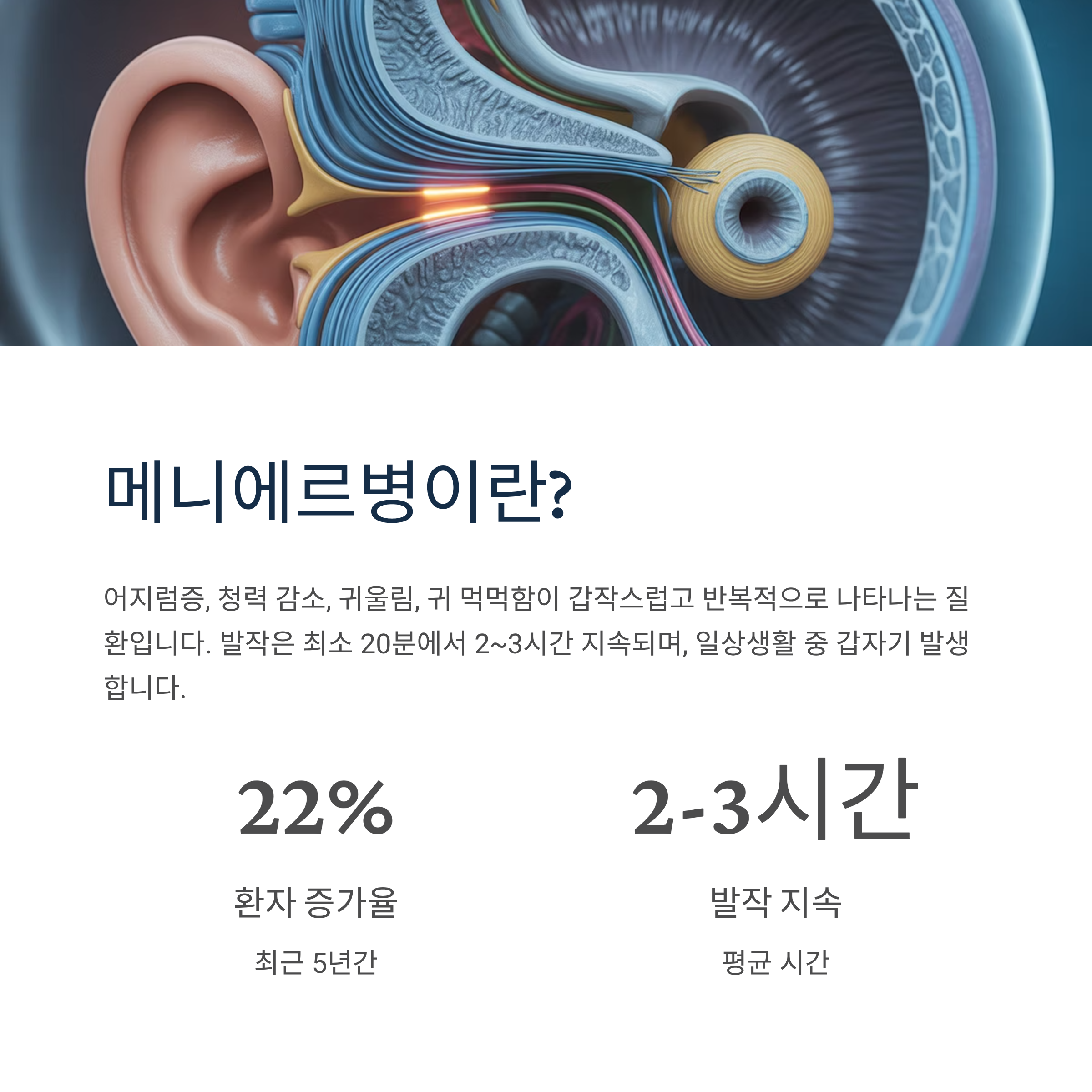 메니에르병은 어지럼증, 청력 감소, 귀울림, 귀 먹먹함 등의 증상이 갑작스럽고 반복적으로 생기는 질병입니다. 발작이 시작되면 최소 20분 이상, 보통 2~3시간 정도 지속되고, 멀쩡히 일상생활을 하는 도중에 갑자기 발작이 일어나서 환자는 큰 고통을 겪습니다.