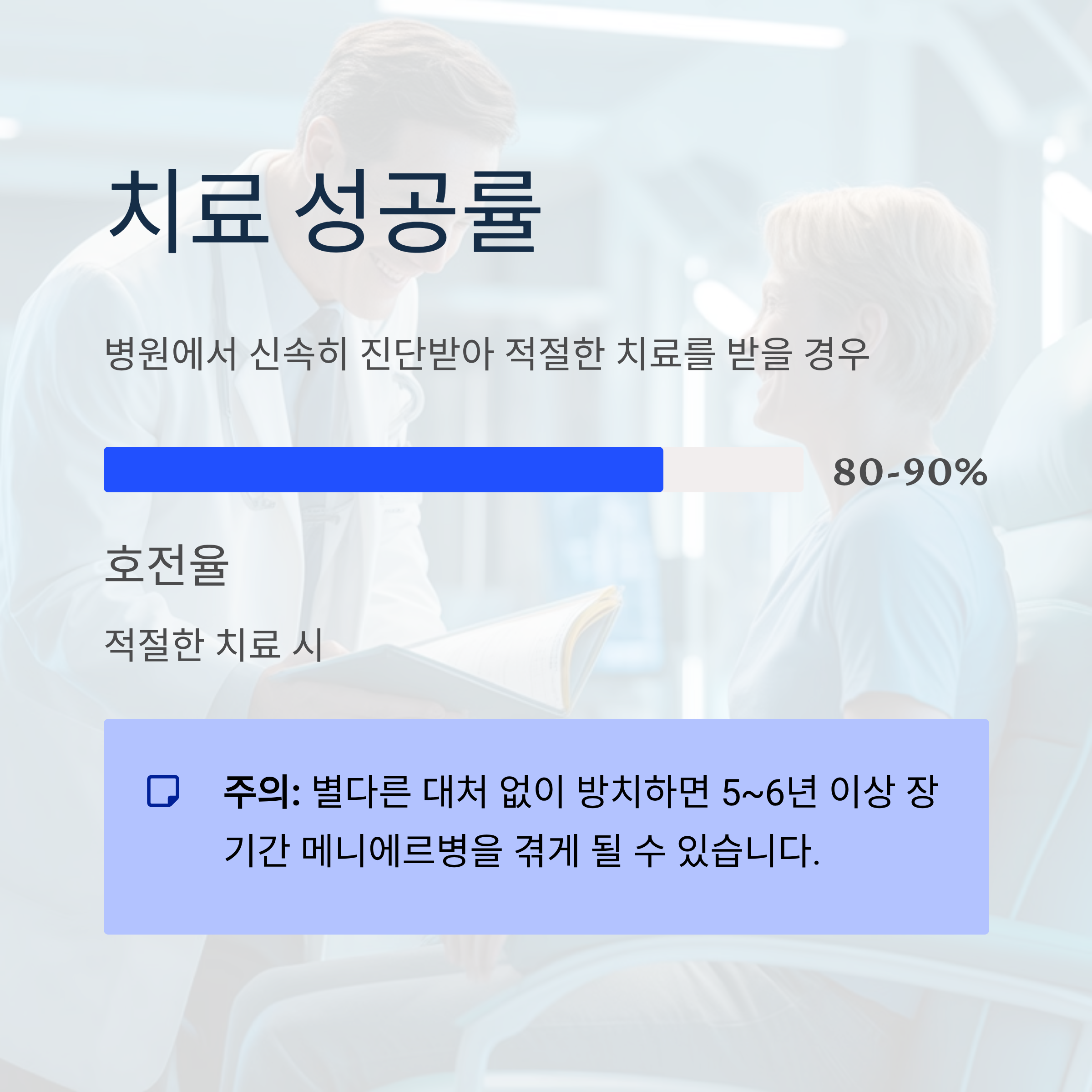 병원에서 메니에르병을 신속히 진단받아 적절한 치료를 받을 경우 80~90%는 호전되니 걱정하지 않으셔도 됩니다. 하지만 별다른 대처 없이 방치하면 5~6년 이상 장기간 메니에르병을 겪게 될 수 있으니 주의가 필요합니다.