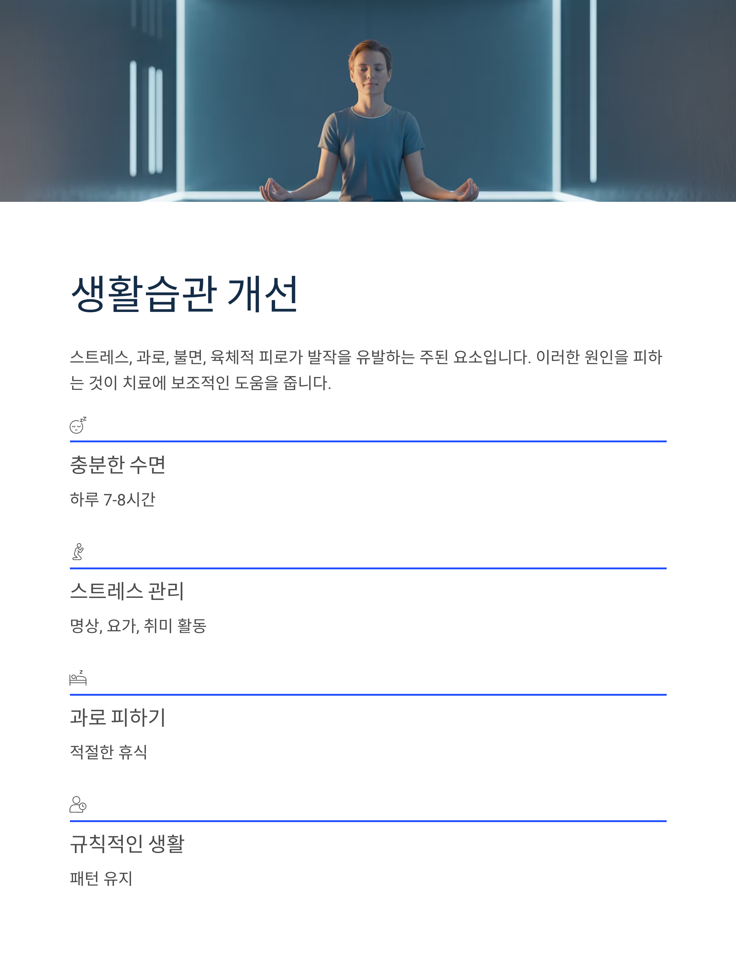 - 스트레스 관리 (명상, 요가, 취미 활동)