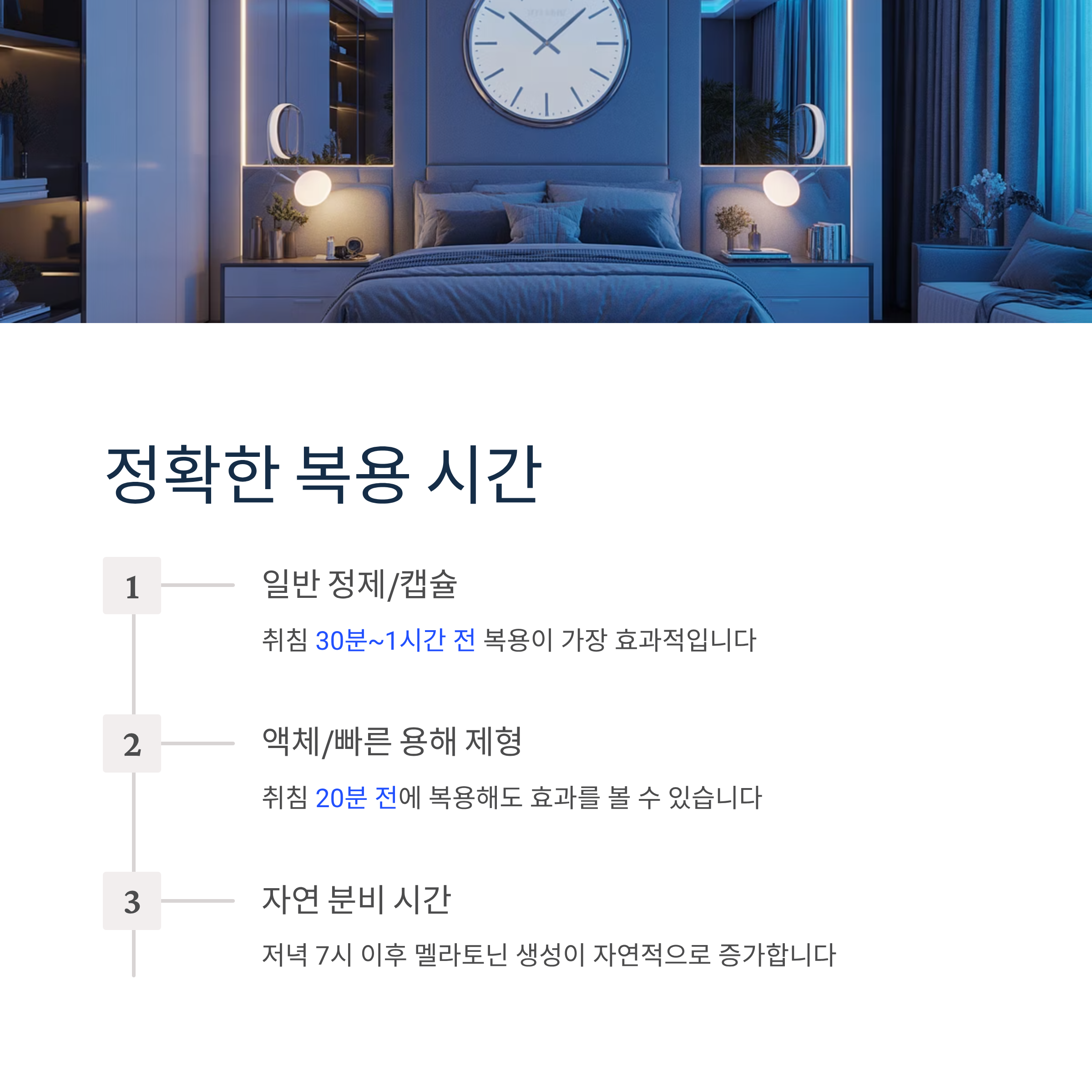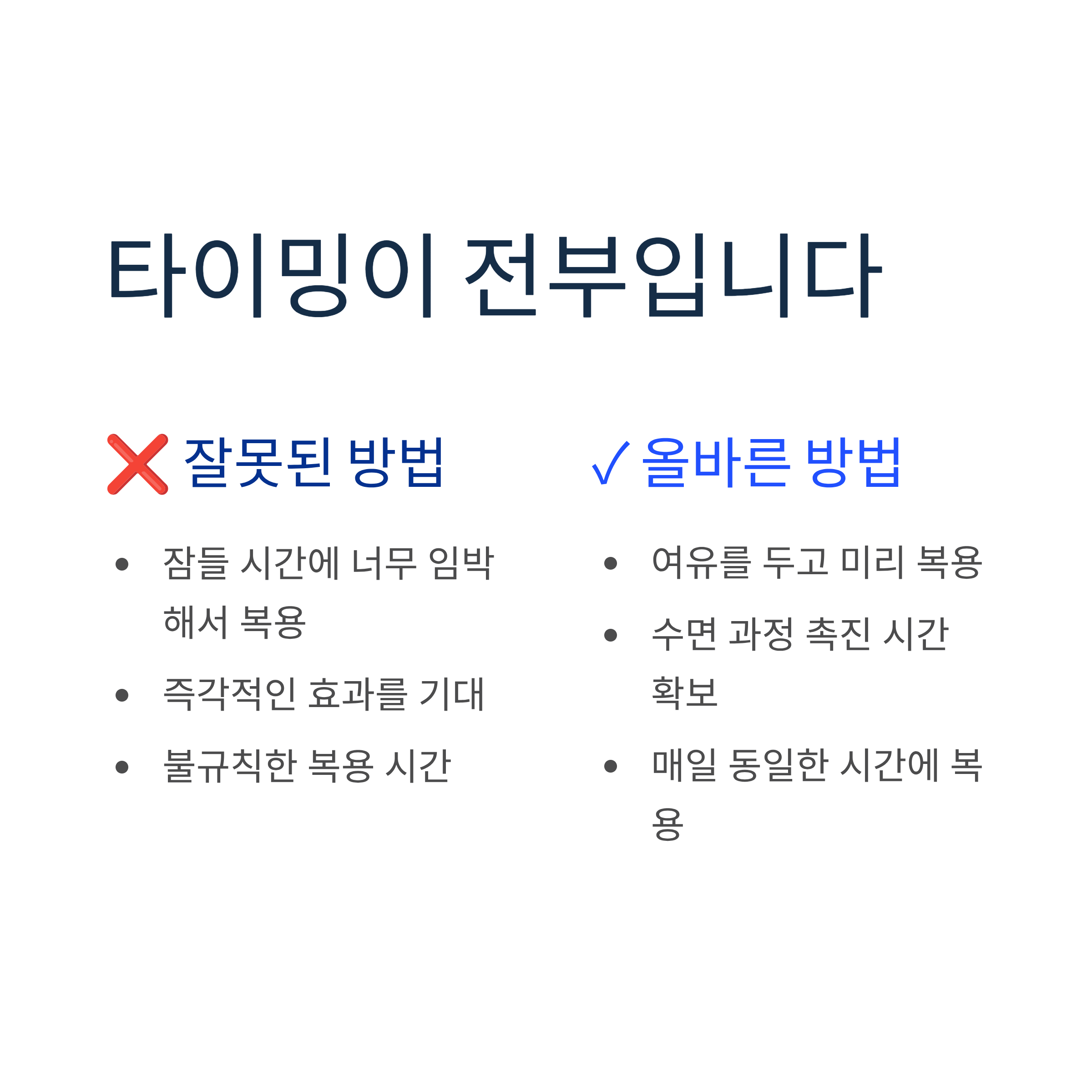 멜라토닌 복용의 가장 중요한 포인트는 취침 시간입니다. 일반 정제나 캡슐의 경우 잠자기 30분에서 1시간 전에 복용하는 것이 가장 효과적입니다. 인체는 저녁 7시 이후에 자연적으로 멜라토닌 생성을 증가시키는데, 잠들기 1~2시간 전에 섭취하면 수면 과정을 촉진하는 데 도움이 됩니다.