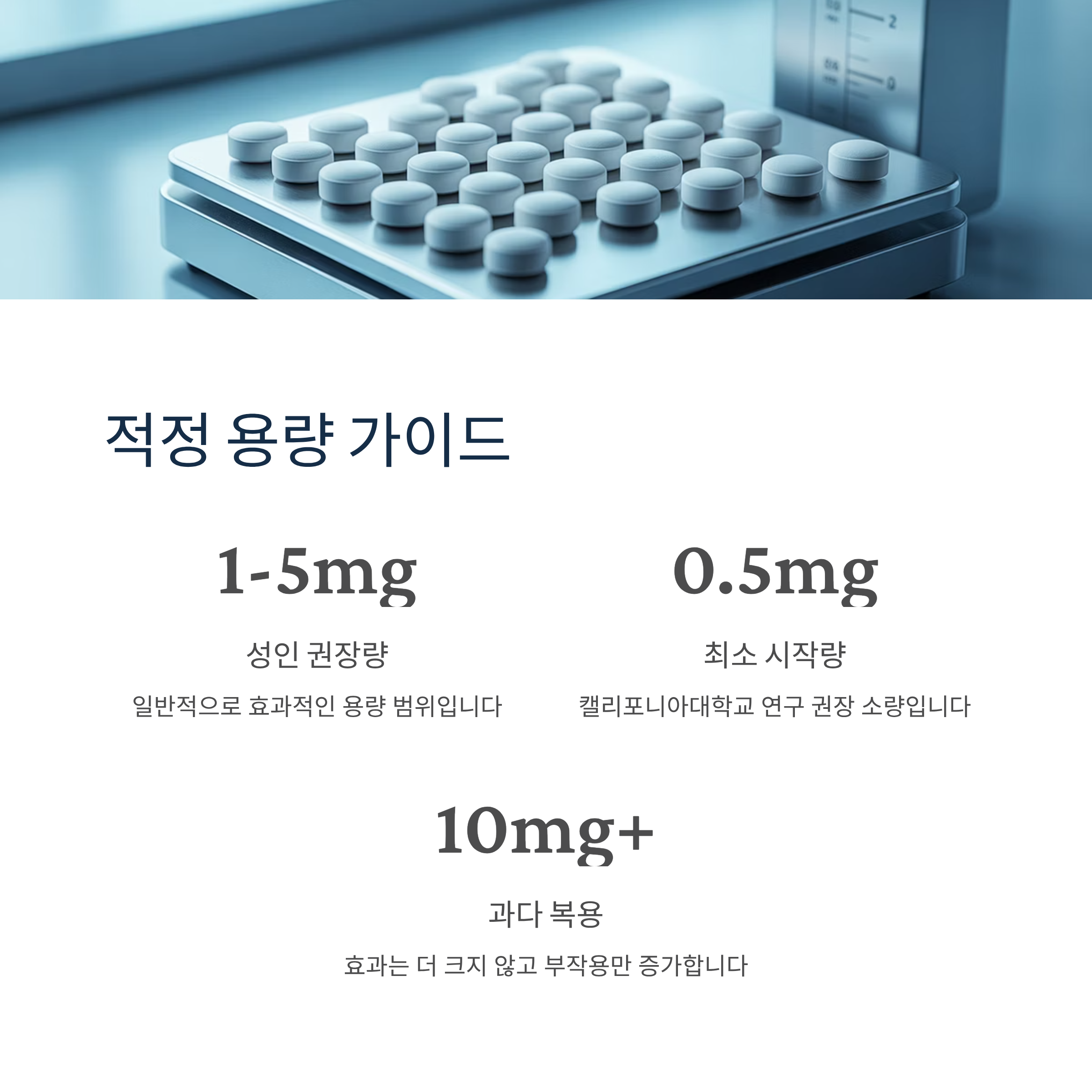 성인의 경우 일반적으로 1~5mg 정도가 효과적이며, 낮은 용량부터 시작해서 개인에게 필요한 양을 찾는 것이 중요합니다. 미국 캘리포니아대학교 연구에 따르면 우리 몸은 멜라토닌을 자체 생산하는 능력이 있기 때문에 가급적 적게 먹는 편이 좋으며, 0.5mg 정도의 소량만 복용하는 것을 권장합니다.