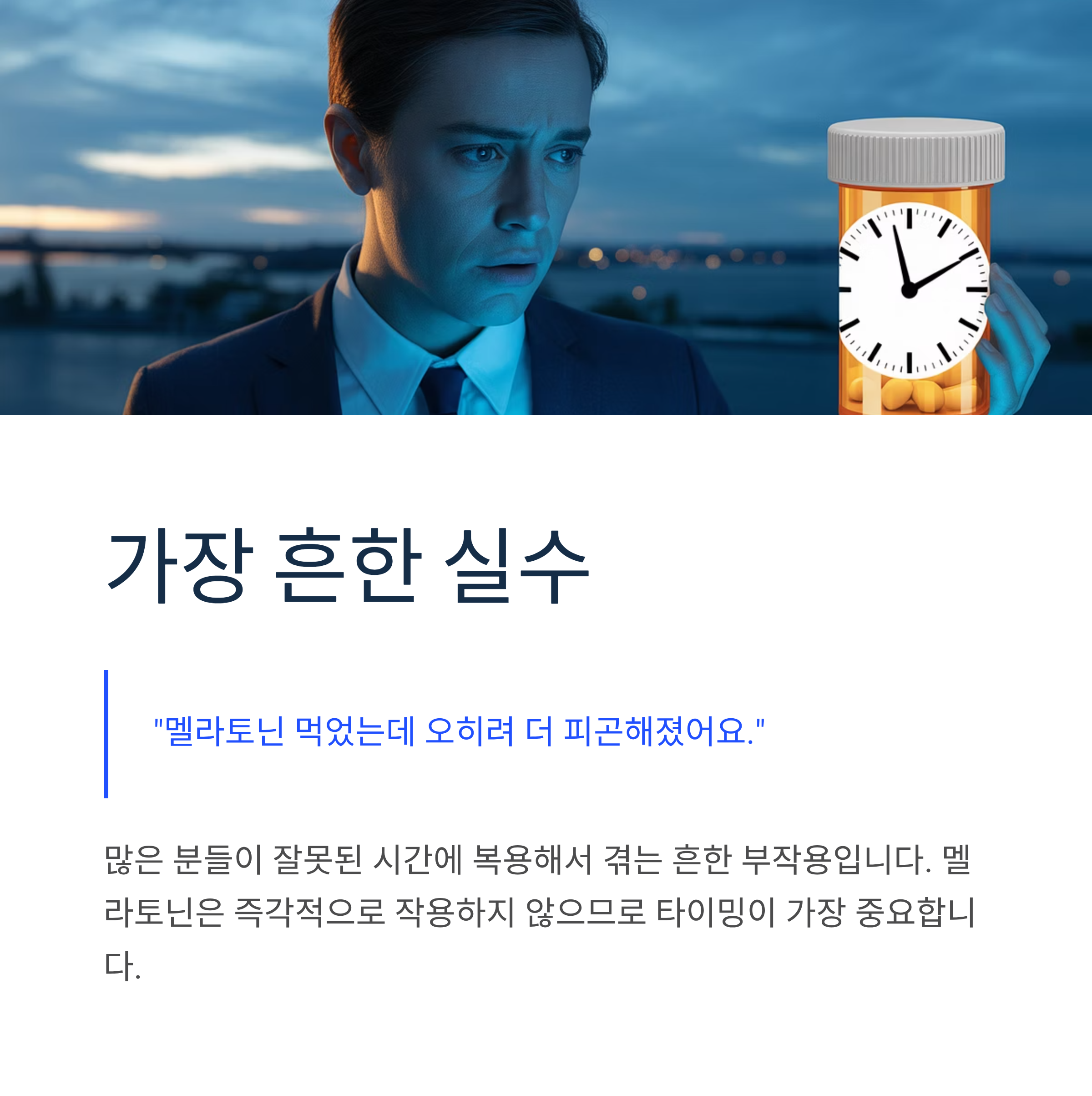 액체나 빠르게 용해되는 제형은 취침 20분 전에 복용해도 효과를 볼 수 있습니다. 많은 분들이 저지르는 실수는 잠들 시간에 너무 임박해서 먹는 것입니다. 멜라토닌은 처방용 수면제처럼 즉각적으로 작용하지 않으므로 여유를 두고 복용해야 합니다.