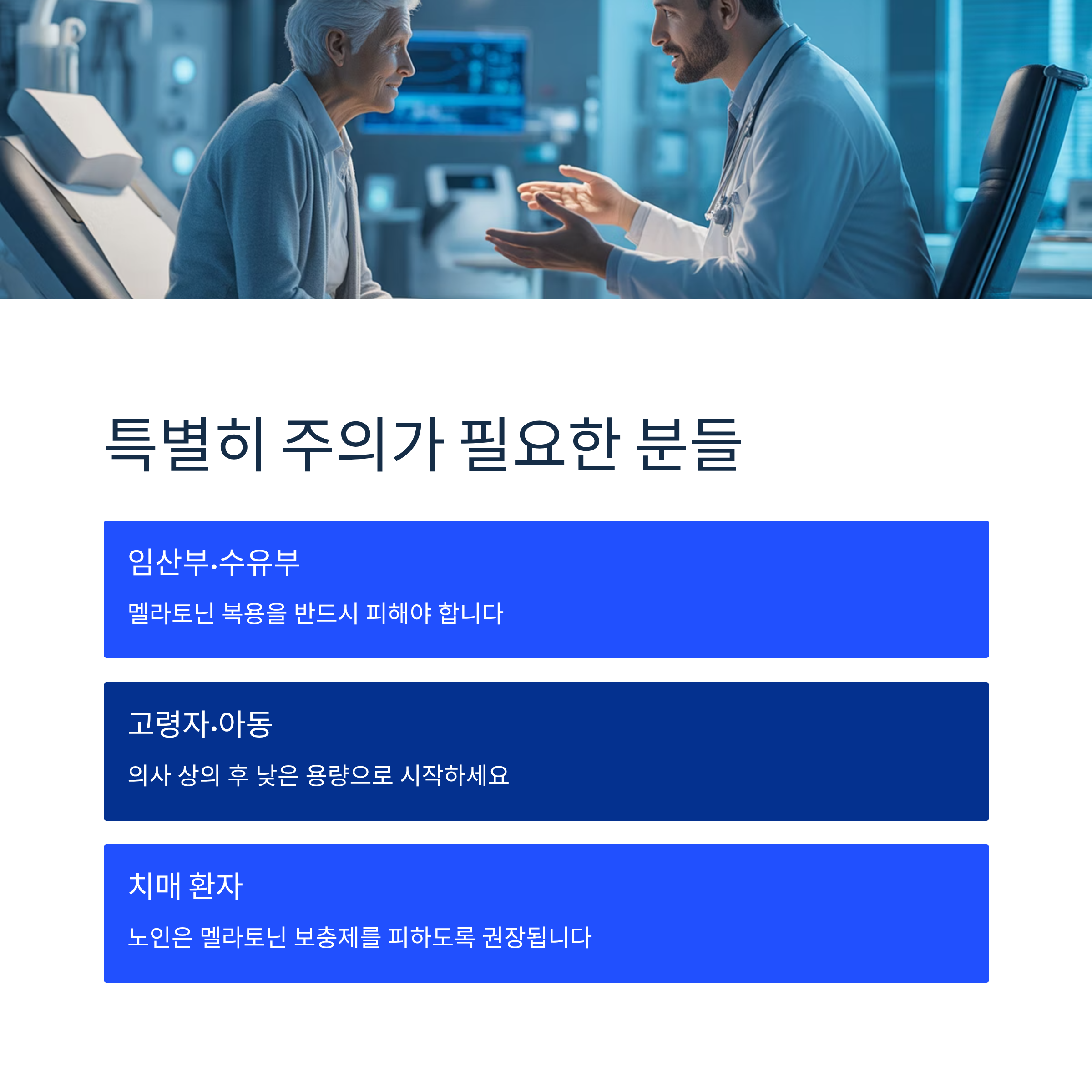 임산부나 모유 수유 중인 여성은 멜라토닌을 피해야 하며, 고령자나 아동은 의사와 상의 후 낮은 용량을 복용해야 합니다. 치매가 있는 노인은 멜라토닌 보충제를 피하도록 권장되며, 멜라토닌은 젊은 사람들보다 노인들에게서 더 오래 활성이 유지되어 낮 시간 동안 졸음을 유발할 수 있습니다.