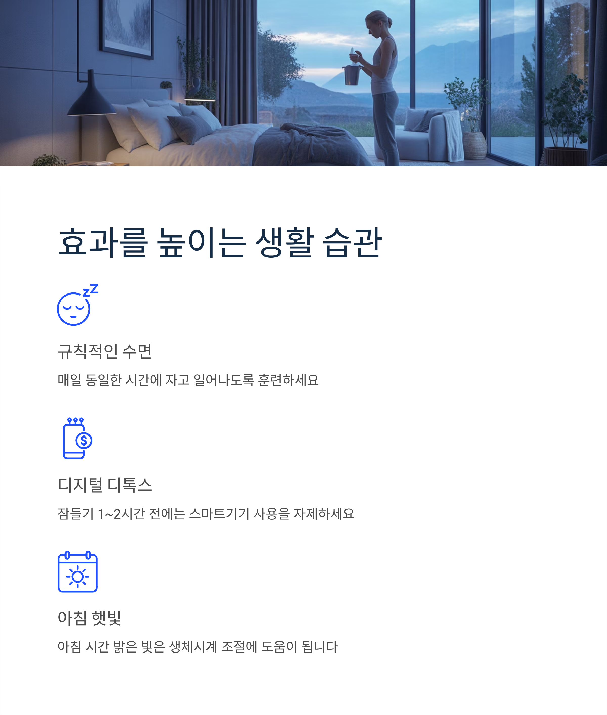 매일 동일한 시간에 자고 일어나도록 훈련하고, 잠들기 1~2시간 전에는 스마트기기 사용을 자제하며, 아침 시간 밝은 빛을 켜두는 것도 생체시계 조절에 도움이 됩니다. 멜라토닌은 보조 수단이며, 건강한 수면 습관이 가장 중요하다는 점을 잊지 마세요.