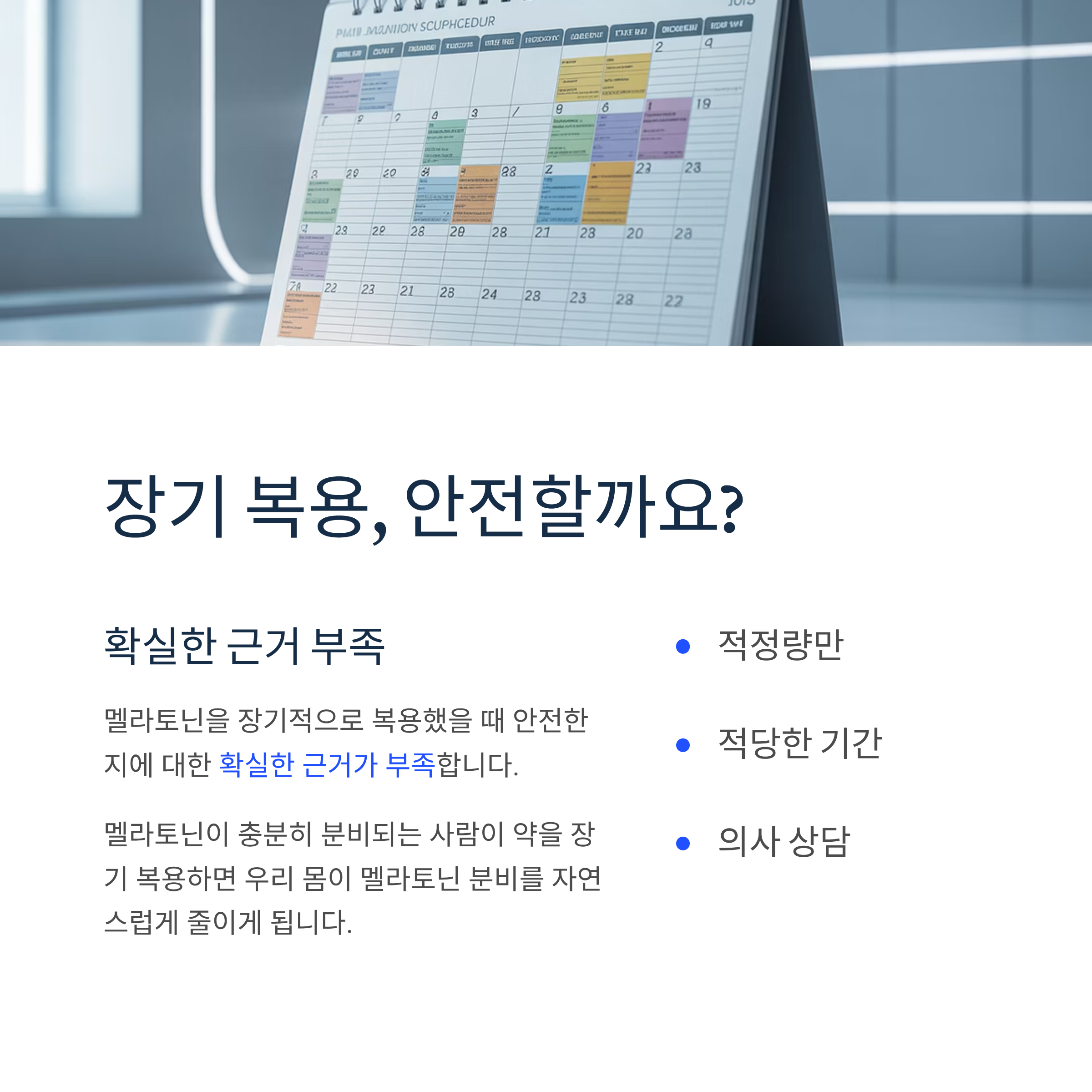 멜라토닌은 장기적으로 복용했을 때 안전한지에 대한 확실한 근거가 부족합니다. 멜라토닌이 충분히 분비되는 사람이 약을 장기 복용하면 우리 몸이 멜라토닌 분비를 자연스럽게 줄이게 되므로, 적정량을 적당한 기간 동안만 복용하는 것이 좋습니다.