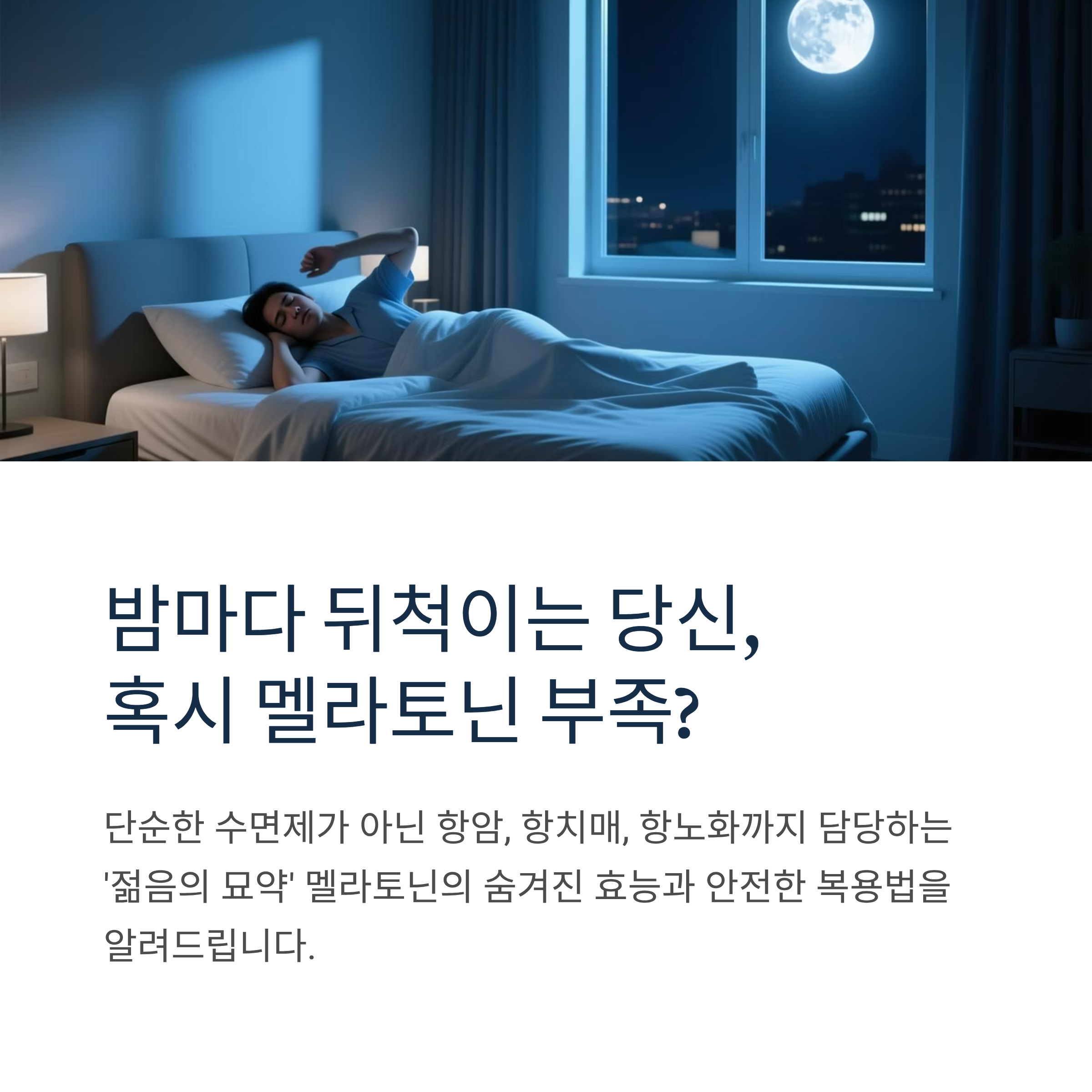 단순히 잠만 재우는 수면제로 알려진 멜라토닌이 실제로는 항암, 항치매, 항노화까지 담당하는 '젊음의 묘약'이라는 사실을 아시나요? 2025년 최신 연구를 바탕으로 멜라토닌의 숨겨진 효능과 안전한 복용법을 공개합니다.