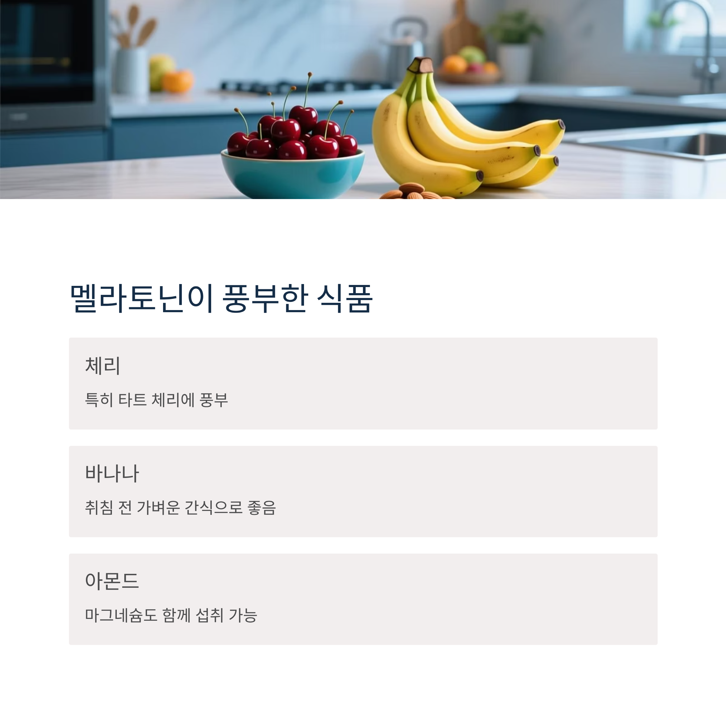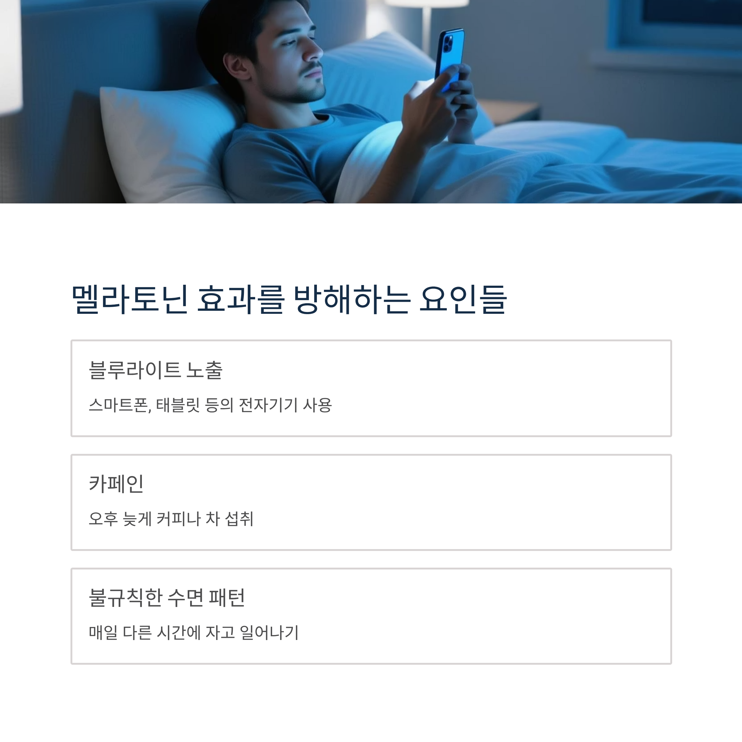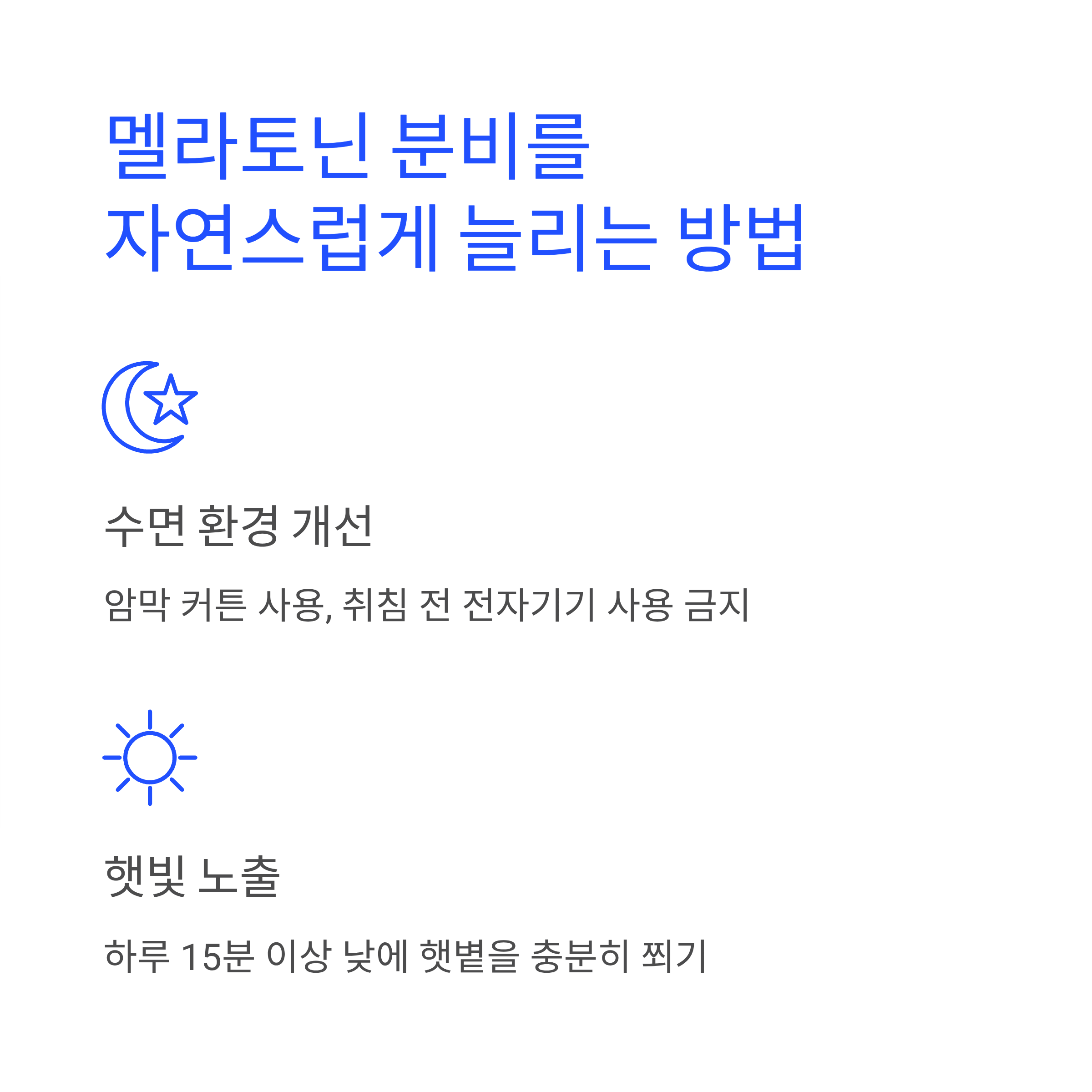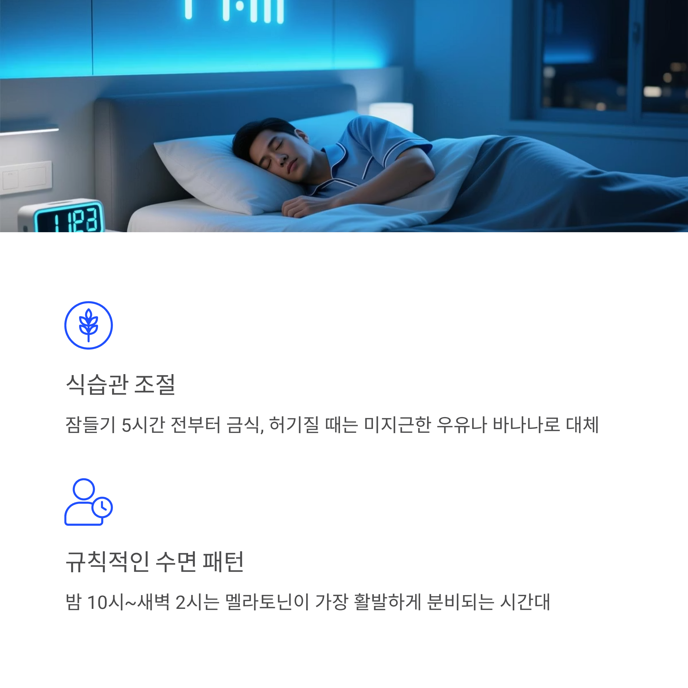 - 규칙적인 수면 패턴: 밤 10시부터 새벽 2시까지는 멜라토닌이 가장 활발하게 분비되는 시간대입니다.