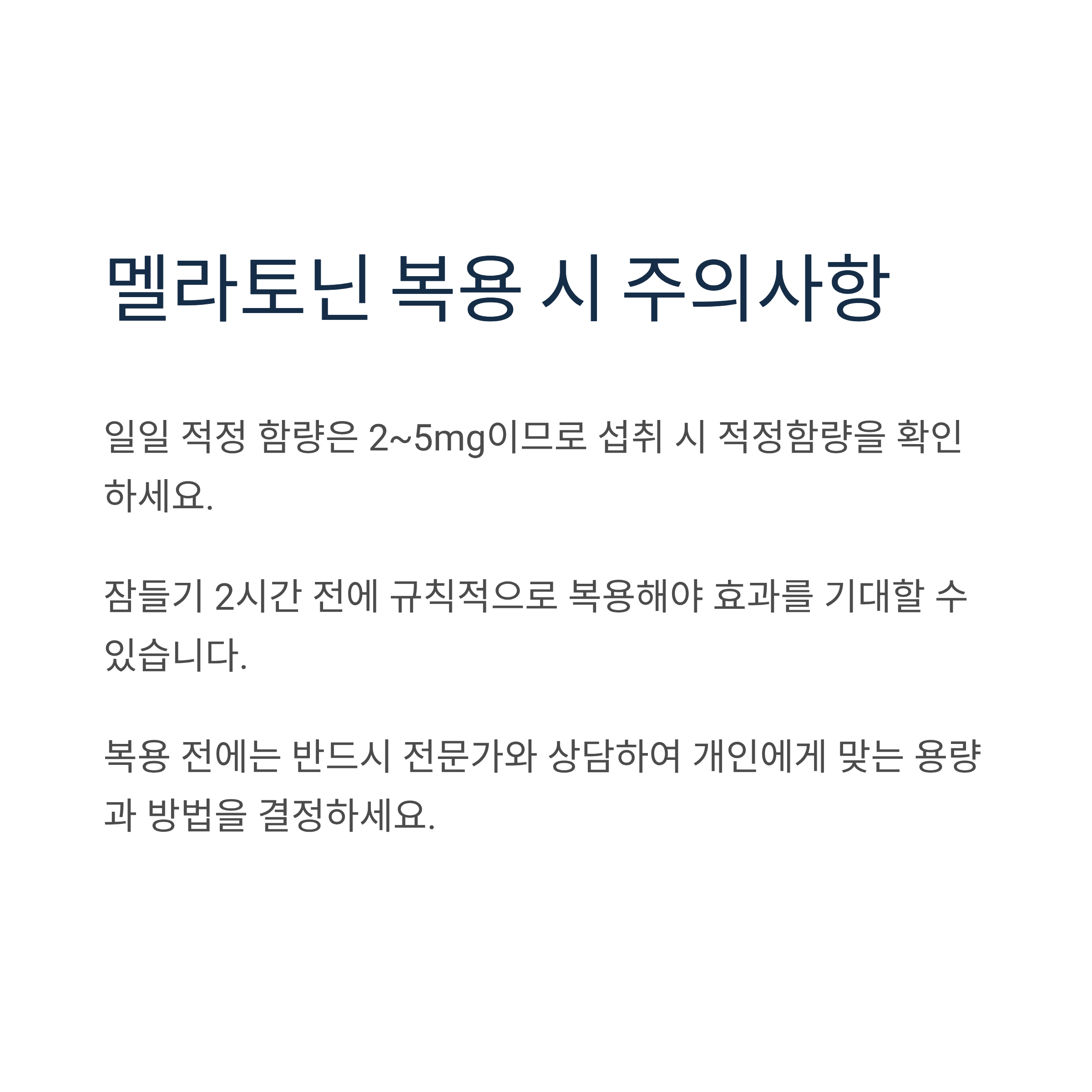 멜라토닌의 일일 적정 함량은 2~5mg이므로 섭취 시 적정함량을 확인 후 섭취해야 하며, 잠들기 2시간 전에 규칙적으로 복용해야 효과를 기대할 수 있습니다. 복용 전에는 반드시 전문가와 상담하여 개인에게 맞는 용량과 방법을 결정하시기 바랍니다.