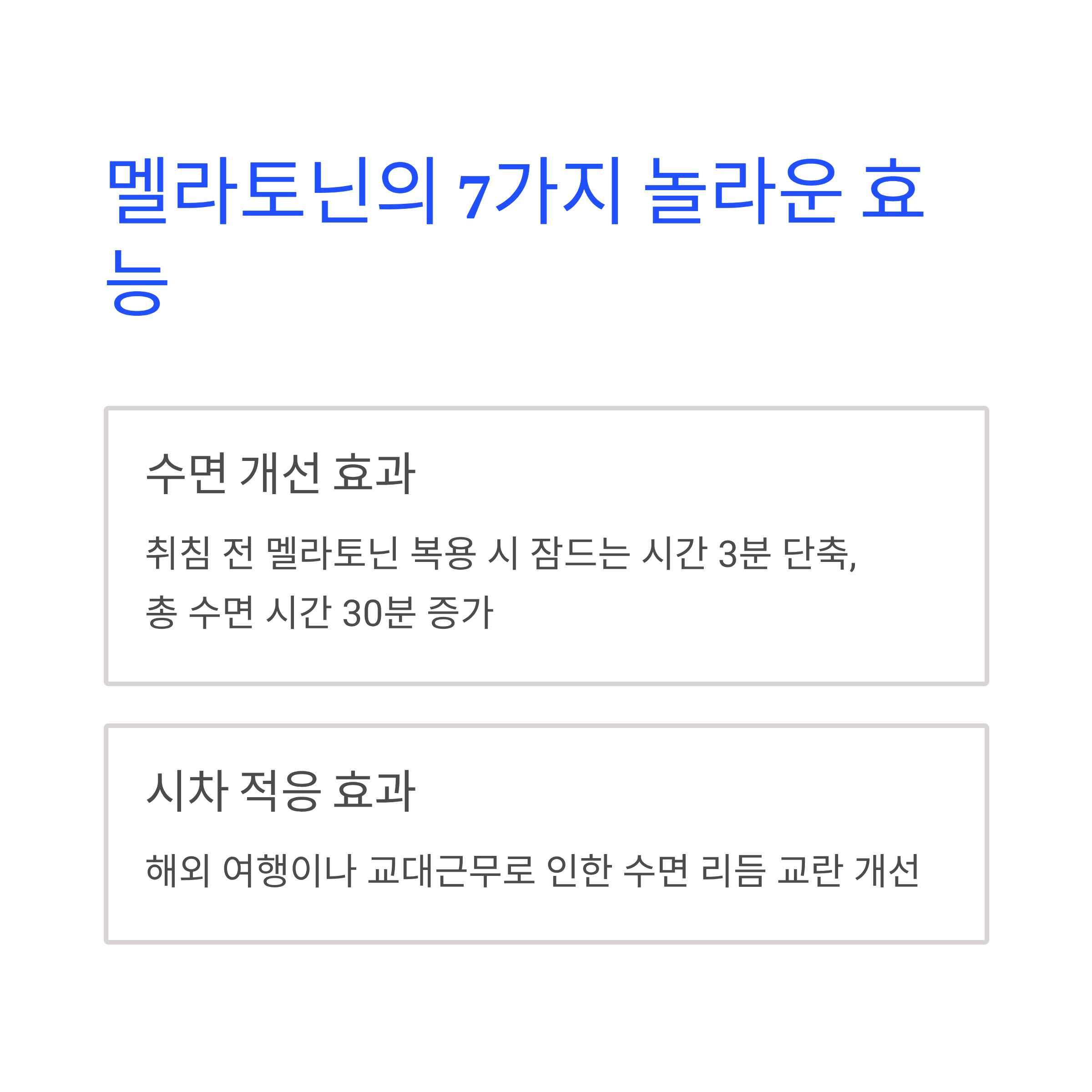 11건의 연구를 검토한 논문에 따르면 취침 전에 멜라토닌을 복용하면 위약을 복용한 대조군 대비 잠드는 데 드는 시간이 3분 가까이 단축되고, 총 수면 시간이 약 30분 증가함을 확인할 수 있었습니다.
