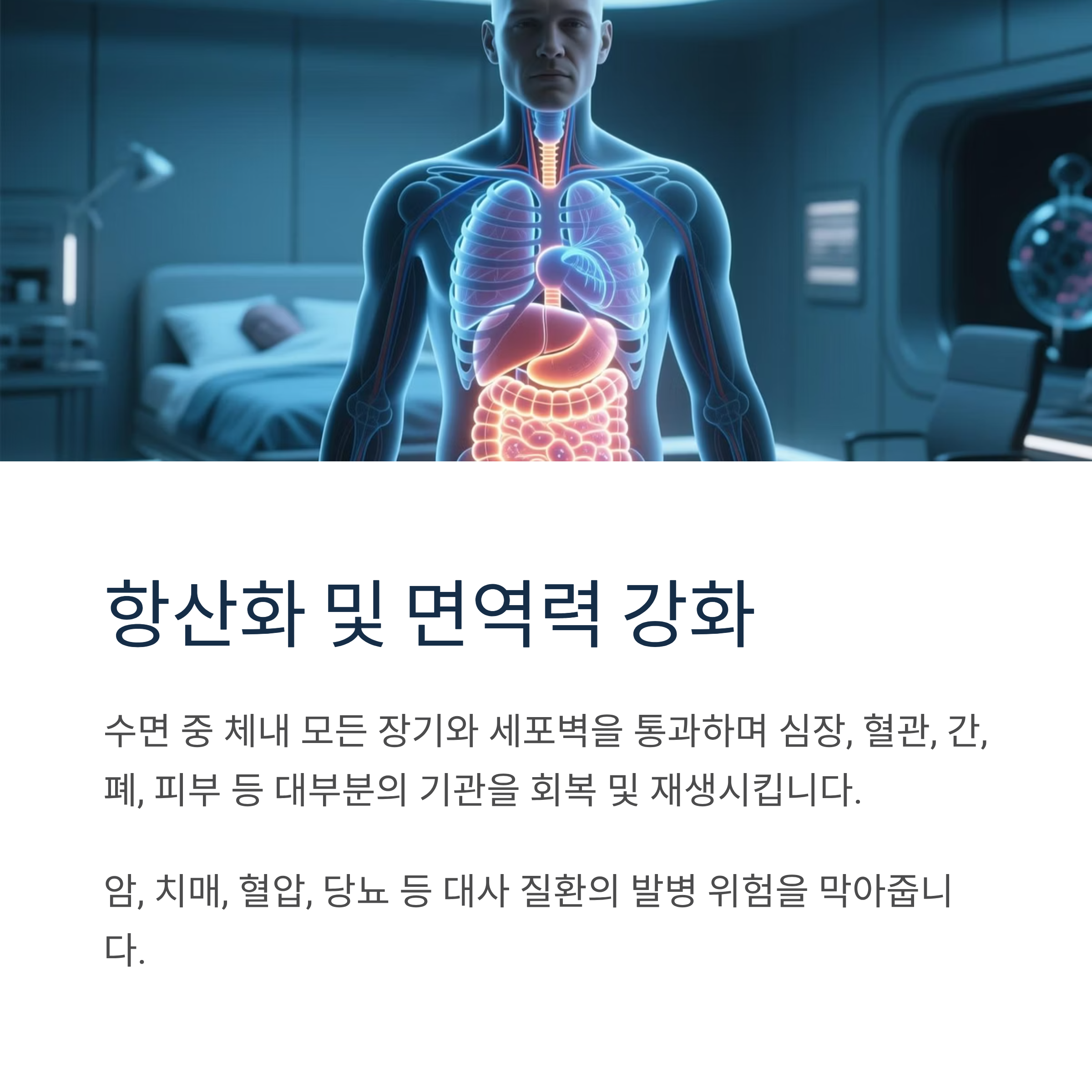 수면 중 체내 모든 장기와 세포의 벽을 통과하며 몸 전체에 빠르게 퍼져 나간 멜라토닌은 심장, 혈관, 간, 폐, 피부 등 대부분의 기관을 회복 및 재생시키고 암, 치매, 혈압, 당뇨 등 대사 질환의 발병 위험을 막습니다.