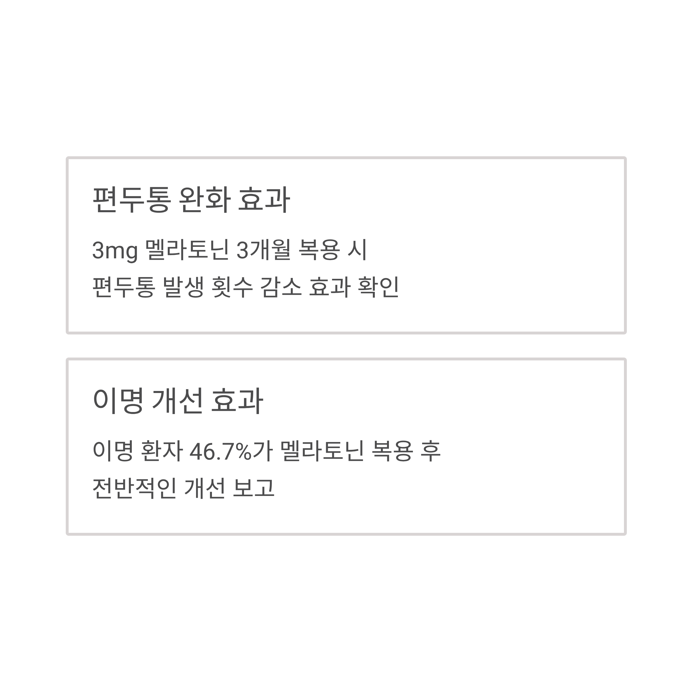 178명의 편두통을 진단 받은 환자들에게 3mg 멜라토닌을 3개월 동안 매일 복용하게 한 결과 편두통 발생 횟수 감소에 효과적인 것으로 밝혀졌습니다.