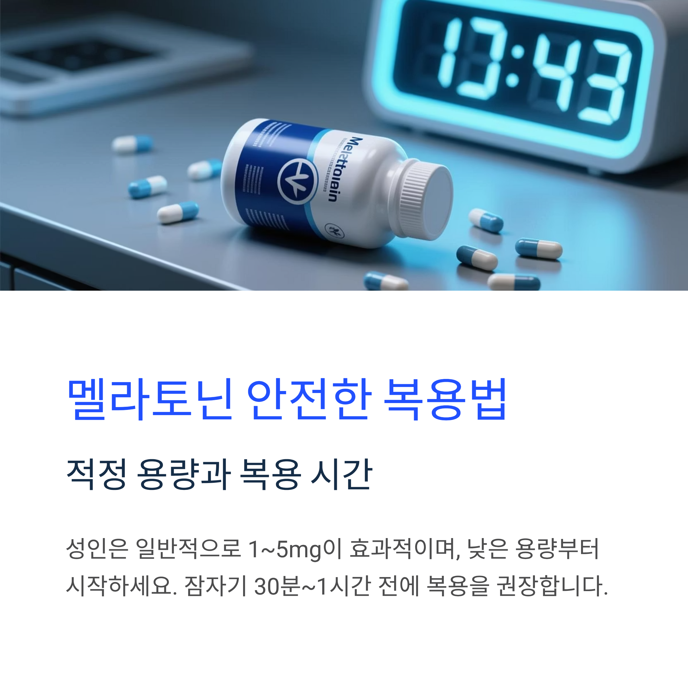 성인은 일반적으로 1~5mg 정도가 효과적입니다. 낮은 용량부터 시작해서 개인에게 필요한 양을 찾으세요. 멜라토닌의 시작 용량은 아주 소량부터 시작해서 적정 용량까지 올려야 합니다.