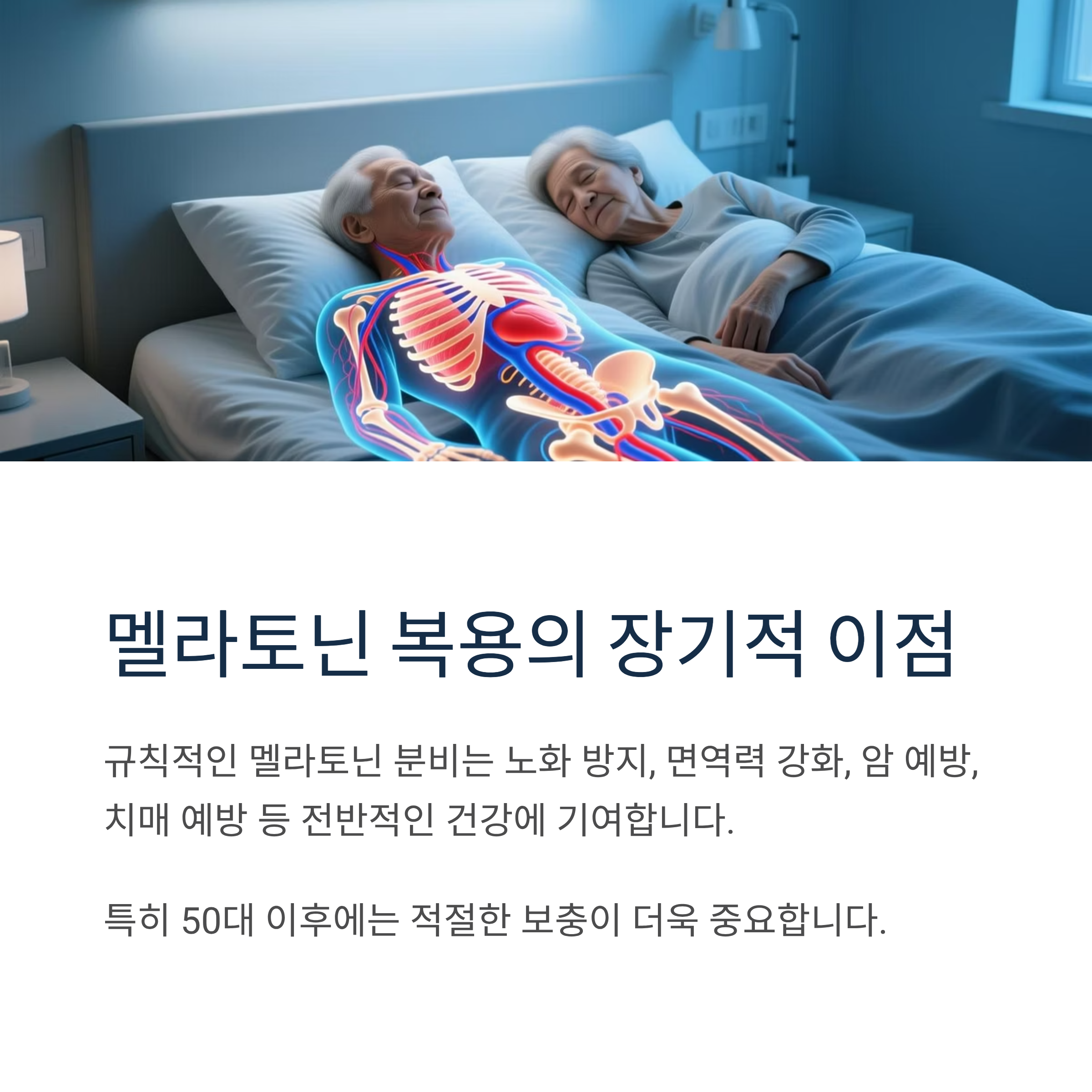 멜라토닌은 단순한 수면제가 아닌, 우리 몸의 전반적인 건강을 책임지는 중요한 호르몬입니다. 특히 50대 이후 멜라토닌 분비가 급격히 감소하는 만큼, 적절한 보충을 통해 건강한 노화를 도모할 수 있습니다.
