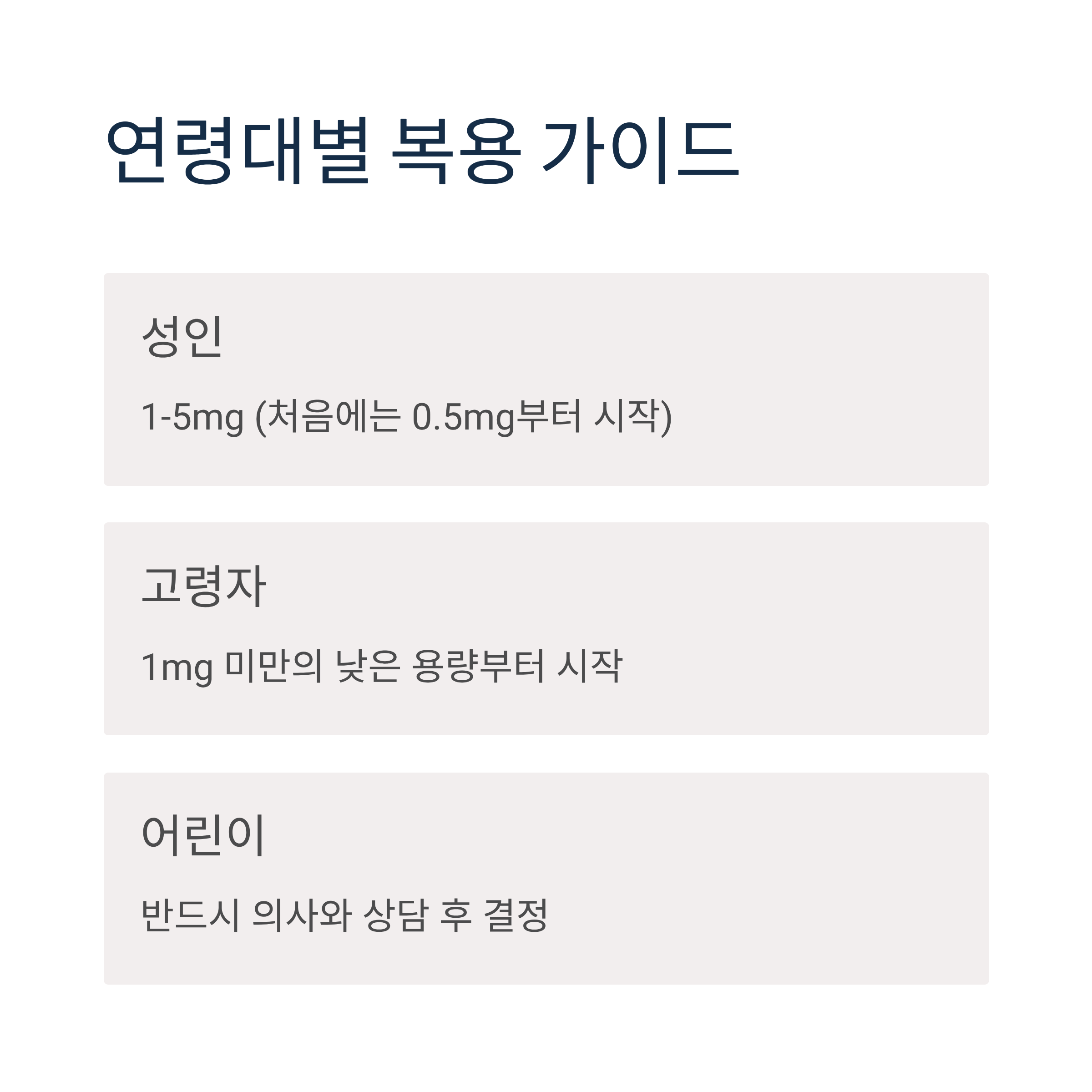 - 성인: 1-5mg (처음에는 0.5mg부터 시작)