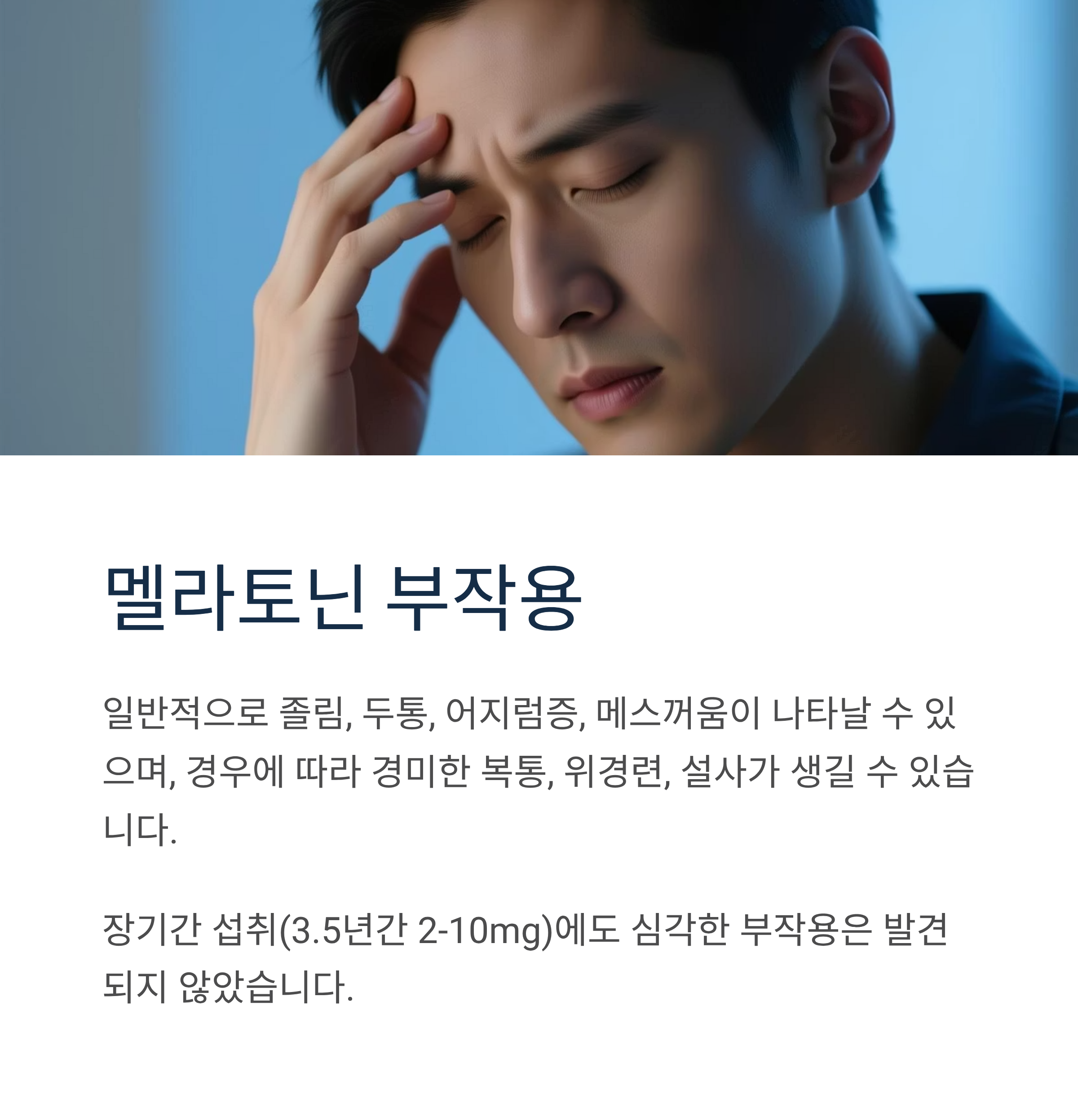 합성 멜라토닌은 화학적인 공정으로 제조되어 오염물질 및 독성물질로 인해 구토, 현기증 등의 부작용을 일으킬 위험이 큽니다.