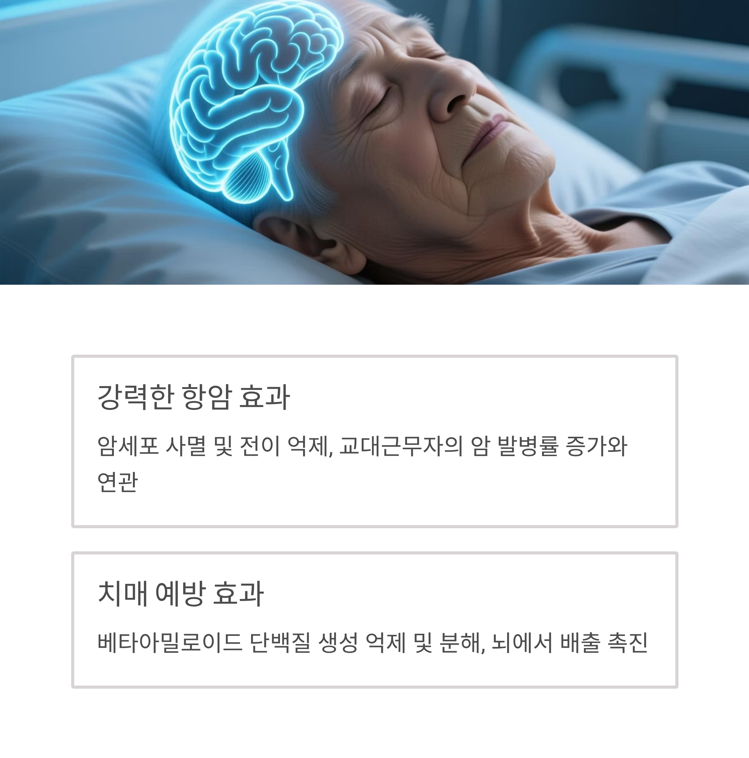 멜라토닌은 치매 유발 물질인 베타아밀로이드 단백질의 생성을 억제 및 분해하는 역할을 합니다. 수면 중에 뇌척수액을 통해 뇌 속에 쌓인 베타아밀로이드 단백질을 제거해 림프관으로 배출시켜 치매를 예방합니다.
