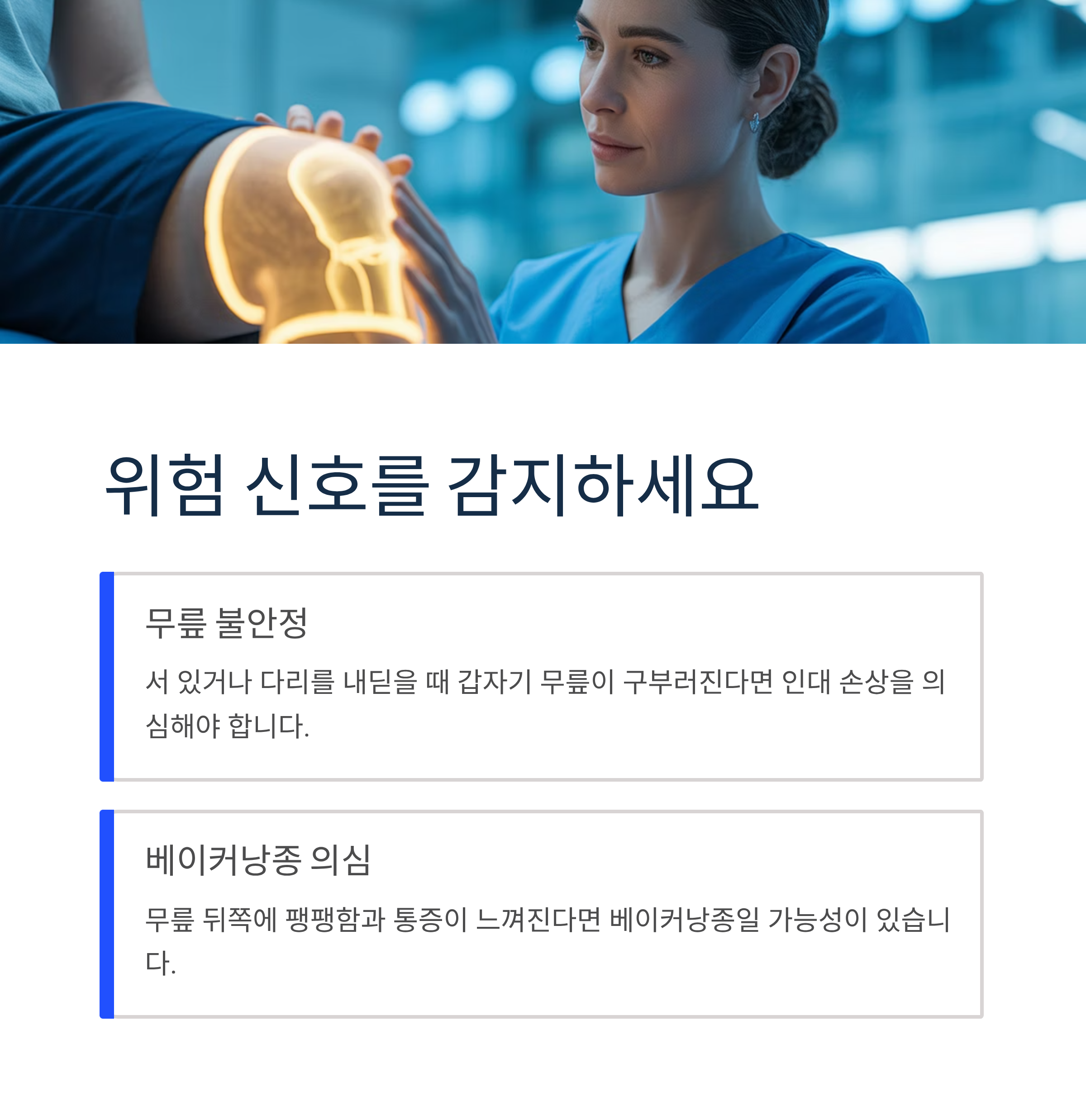 운동 범위가 줄어들거나 무릎이 완전히 펴지지 않는다면 주의가 필요합니다. 무릎에 안정감이 떨어져 서 있거나 다리를 내딛을 때 갑자기 무릎이 구부러지는 증상이 나타난다면 인대 손상을 의심해봐야 합니다. 무릎 뒤쪽에 팽팽함과 통증이 느껴진다면 베이커낭종일 가능성이 있습니다.