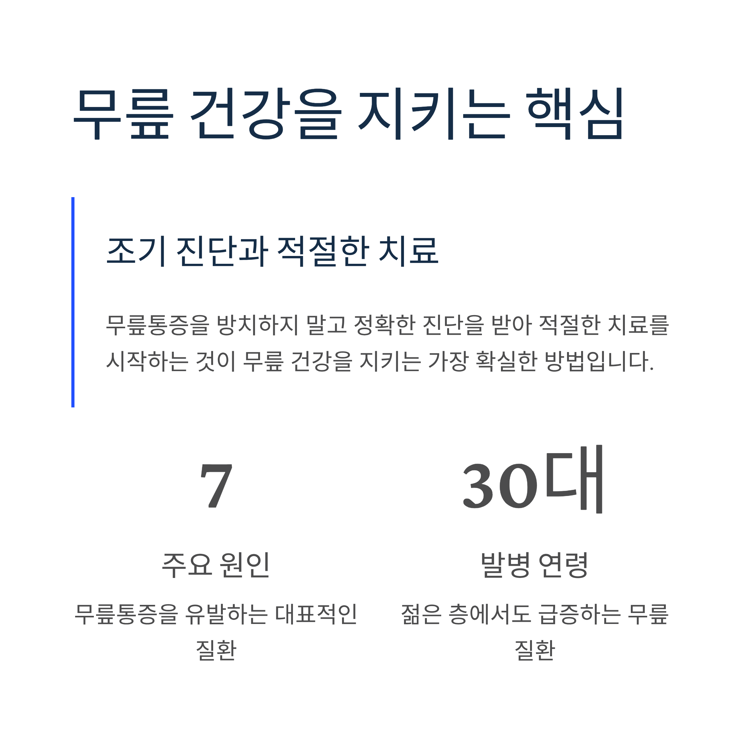 무릎통증을 방치하면 심각한 합병증과 무릎관절 불안정성, 관절염으로 이어질 수 있습니다. 조기에 정확한 진단을 받고 적절한 치료를 시작하는 것이 무릎 건강을 지키는 가장 확실한 방법입니다.