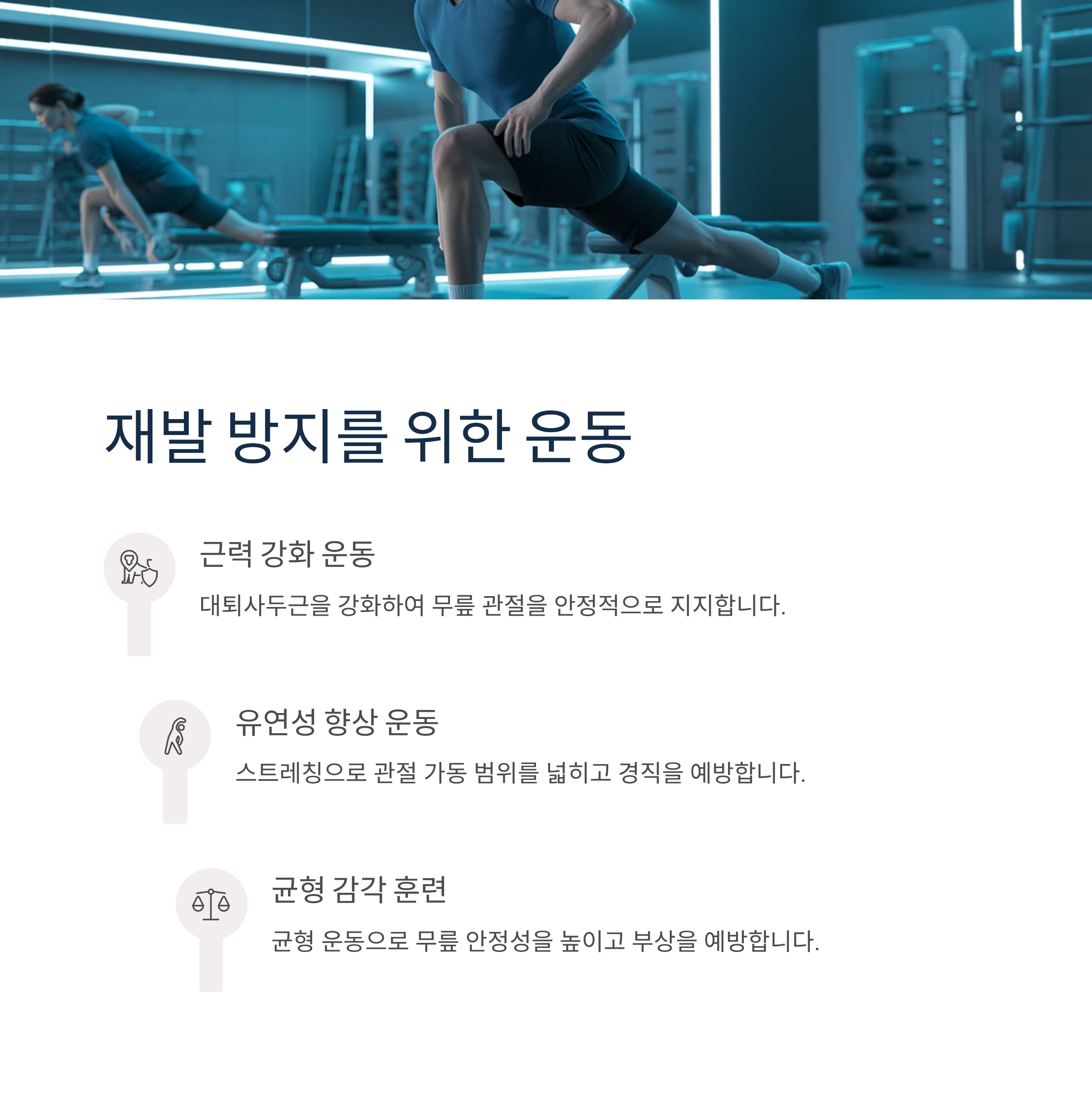 여섯째, 무릎 활액낭염은 무릎 주위 활액낭에 염증이 생기는 질환으로 반복적인 무릎 사용이나 외상으로 발생합니다. 일곱째, 반월판 파열은 충격이나 갑작스러운 비틀림으로 인한 연골 손상으로 무릎 통증과 함께 튀는 느낌, 붓기가 동반됩니다.