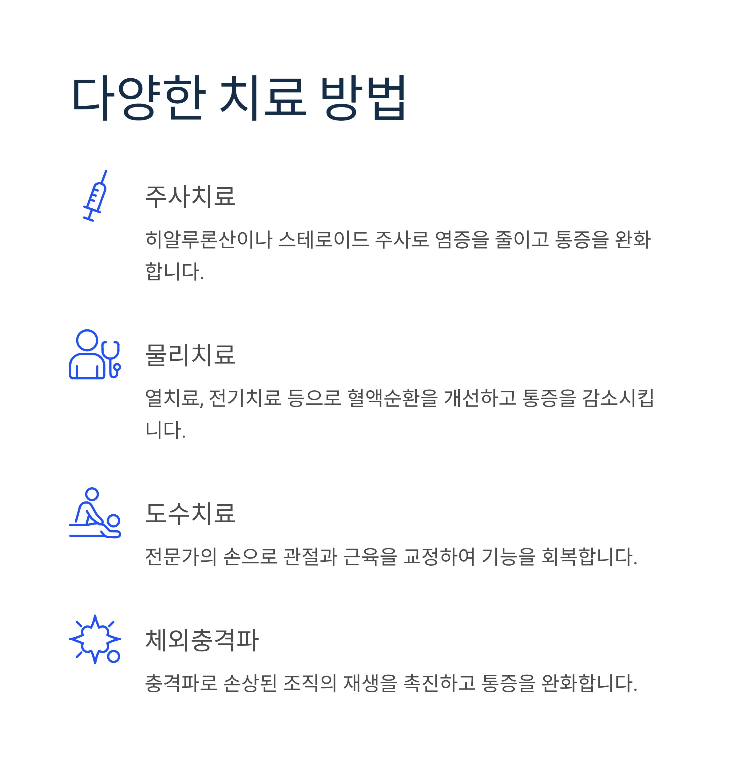 치료는 통증의 원인과 정도에 따라 주사치료, 물리치료, 도수치료, 체외충격파치료 등을 시행합니다. 히알루론산 주사나 스테로이드 주사로 염증을 줄이고, 근력 강화 운동과 유연성 향상 운동으로 재발을 방지합니다.