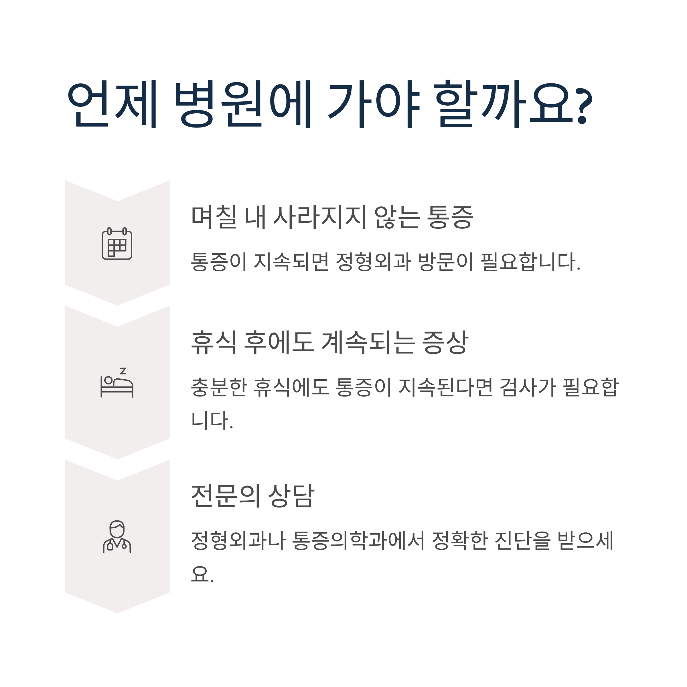 무릎통증이 며칠 안에 사라지지 않거나 휴식 후에도 지속된다면 정형외과나 통증의학과를 방문해 정확한 검사를 받아야 합니다. X-ray로 뼈 구조를 확인하고, 초음파 검사로 연조직과 힘줄 상태를 파악할 수 있습니다.