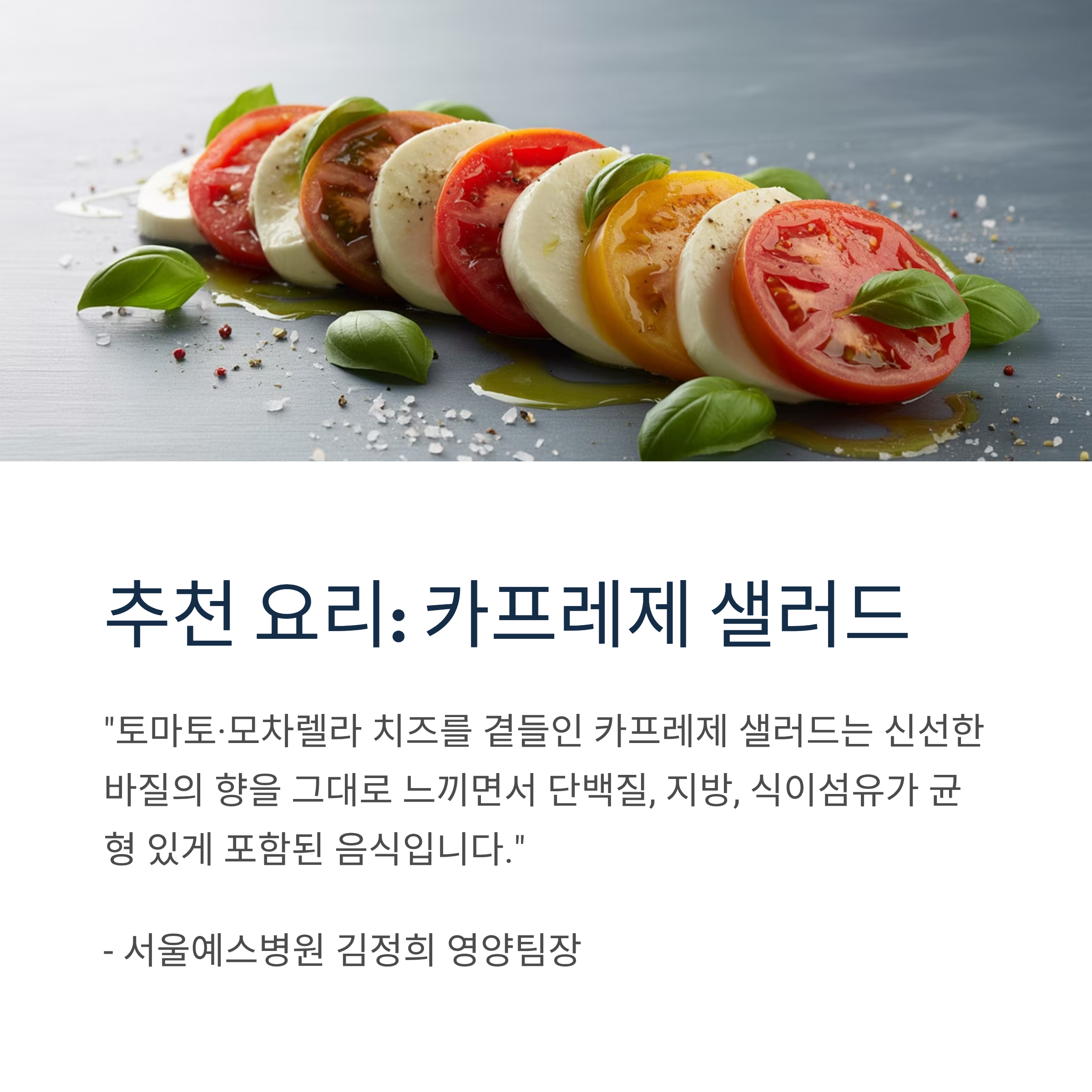 서울예스병원 김정희 영양팀장은 "바질이 들어가는 요리로 카프레제 샐러드를 추천한다"며 "토마토·모차렐라 치즈를 곁들인 카프레제 샐러드는 신선한 바질의 향을 그대로 느끼면서 단백질, 지방, 식이섬유가 균형 있게 포함된 음식"이라고 말했습니다.