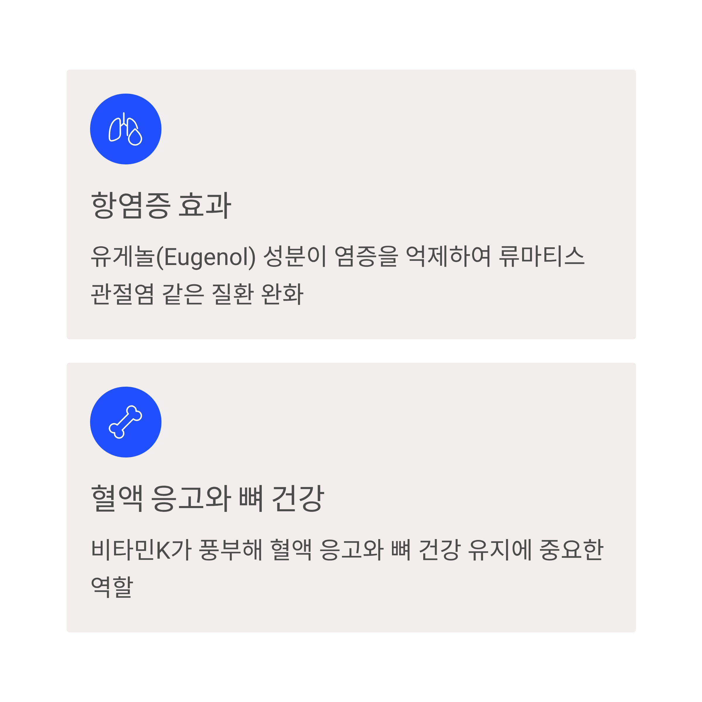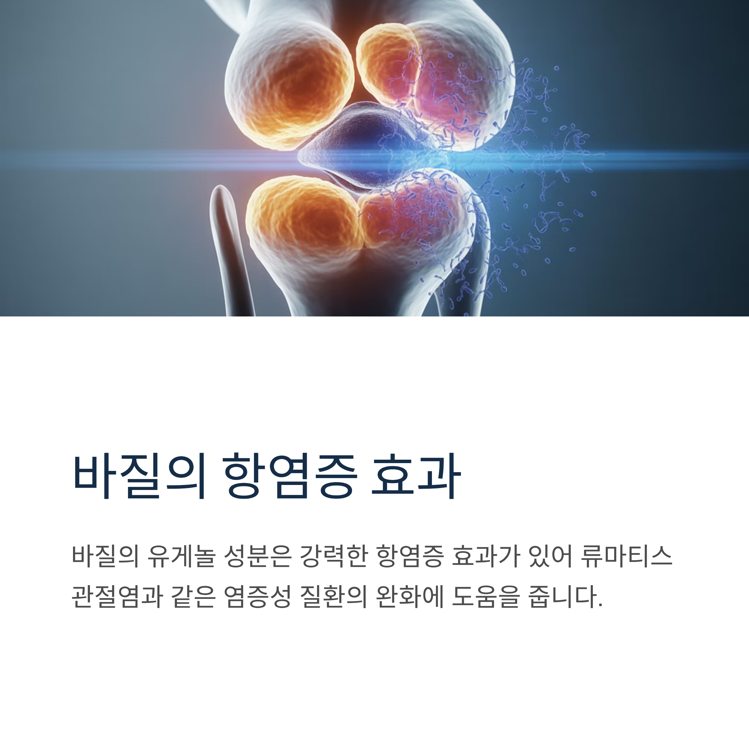 바질의 유게놀(Eugenol) 성분은 강력한 항염증 효과를 가지고 있습니다. 이 성분은 염증을 억제하는 작용을 하여 류마티스 관절염과 같은 염증성 질환의 완화에 도움을 준다고 알려져 있습니다.