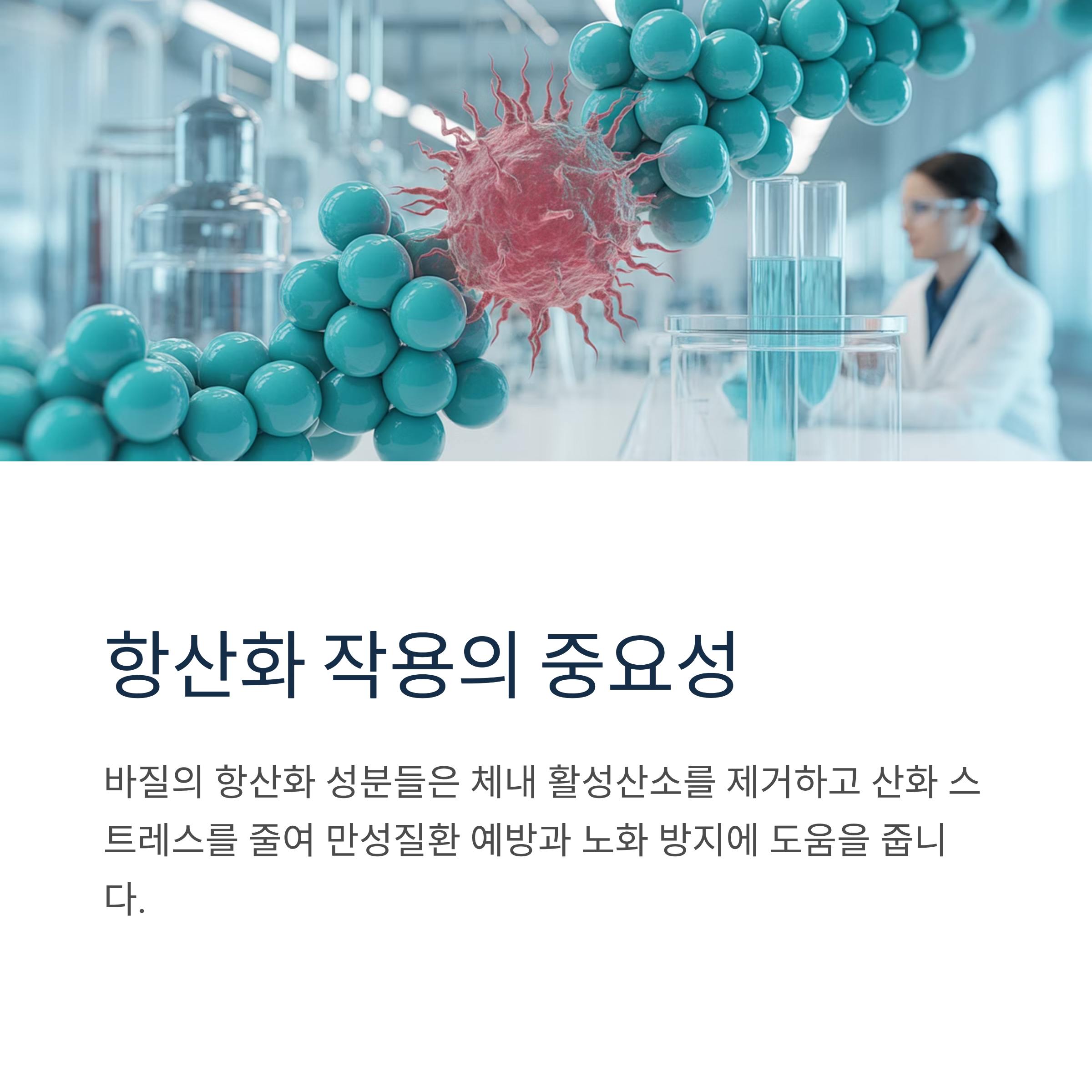 바질에는 베타카로틴, 비타민C, 플라보노이드 등 다양한 항산화 물질이 풍부하게 들어있습니다. 이러한 항산화 성분들은 체내 활성산소를 제거하고 산화 스트레스를 줄여 만성질환 예방에 도움을 줍니다. 활성산소는 우리 몸의 세포를 공격하고 노화를 촉진시키는 주범이므로, 바질의 항산화 효과는 매우 중요한 건강상 이점입니다.