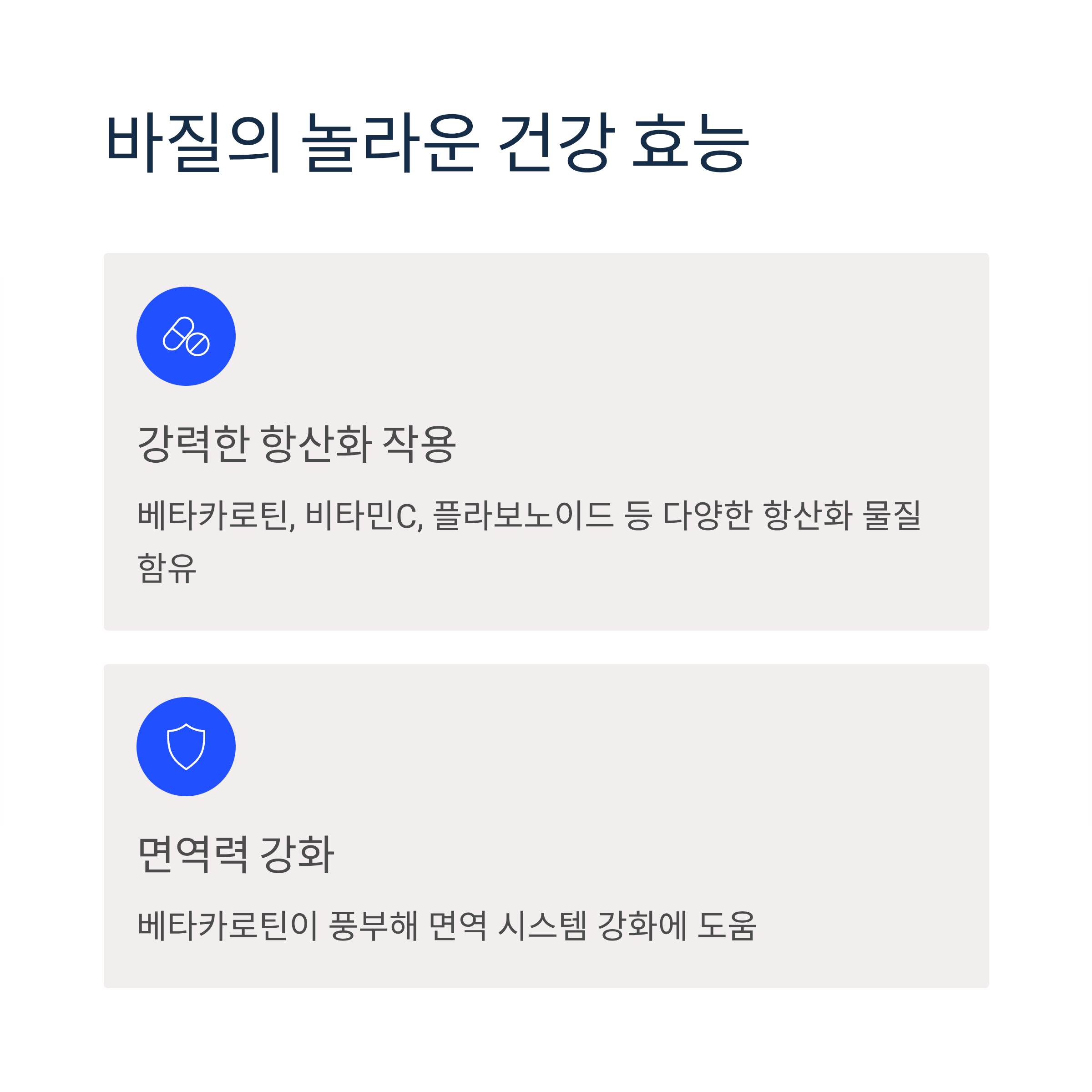 바질에 풍부한 베타카로틴은 주황색 채소와 녹색 채소에 많이 포함된 영양소로, 면역력을 높이는 데 탁월한 효과가 있습니다. 이는 감기나 구내염 같은 질병을 예방하는 데 도움을 주며, 전반적인 면역 시스템을 강화시킵니다.