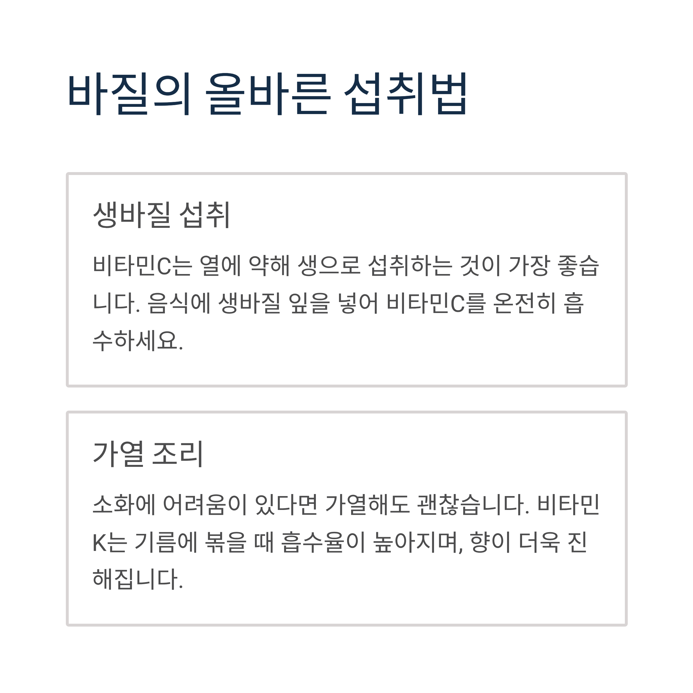 소화에 어려움을 겪는 사람이라면 바질을 가열해서 먹어도 괜찮습니다. 가열 과정에서 일부 비타민은 파괴될 수 있지만, 비타민K와 같은 지용성 비타민은 기름에 볶아서 섭취할 때 체내 흡수율이 높아집니다. 또한 바질 특유의 향을 내는 에센셜 오일은 가열되면서 향이 더욱 진해지는 장점이 있습니다.