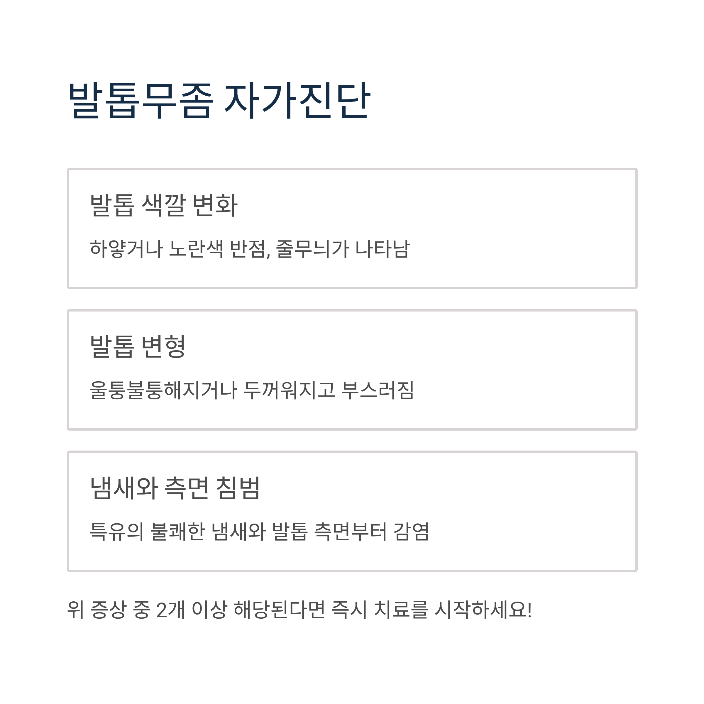발톱무좀은 초기에는 별다른 증상이 없어 감염 여부를 알아차리기 어렵습니다. 다음 증상 중 2개 이상 해당된다면 즉시 치료를 시작해야 합니다: