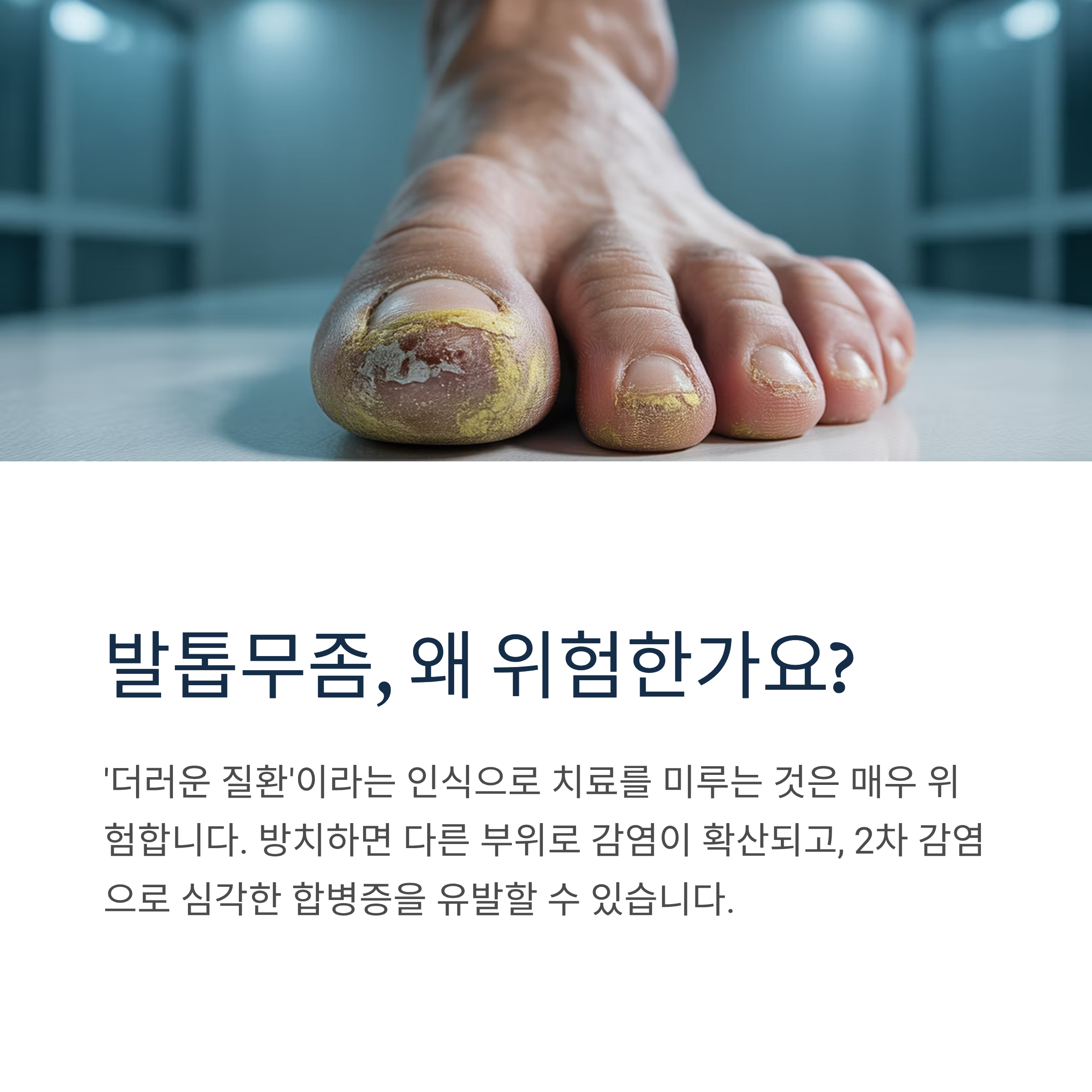 '발톱무좀 = 더러운 질환'이라는 인식 때문에 치료를 미루는 경우가 많지만, 이는 매우 위험한 생각입니다. 발톱무좀을 방치하면 다른 부위로 감염이 확산되고, 2차 감염으로 심각한 합병증을 유발할 수 있습니다.