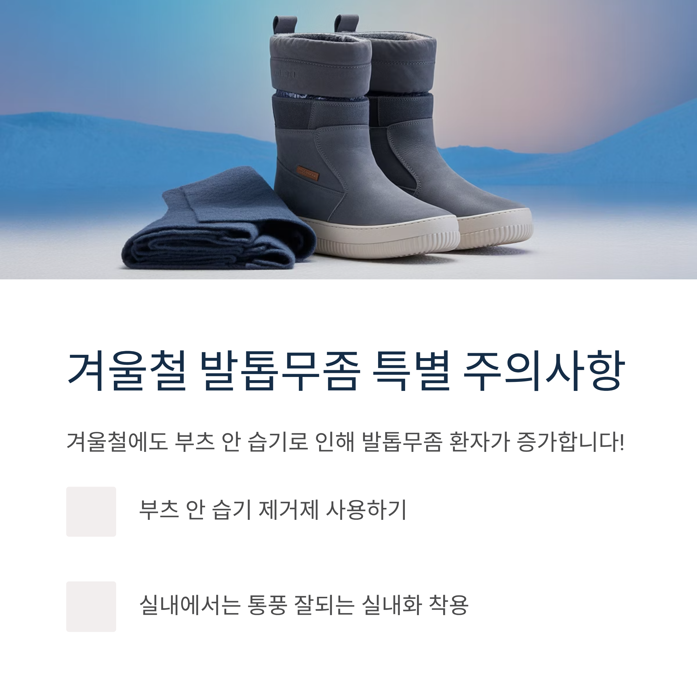 겨울철에도 부츠 안 습기로 인해 발톱무좀 환자가 증가합니다: