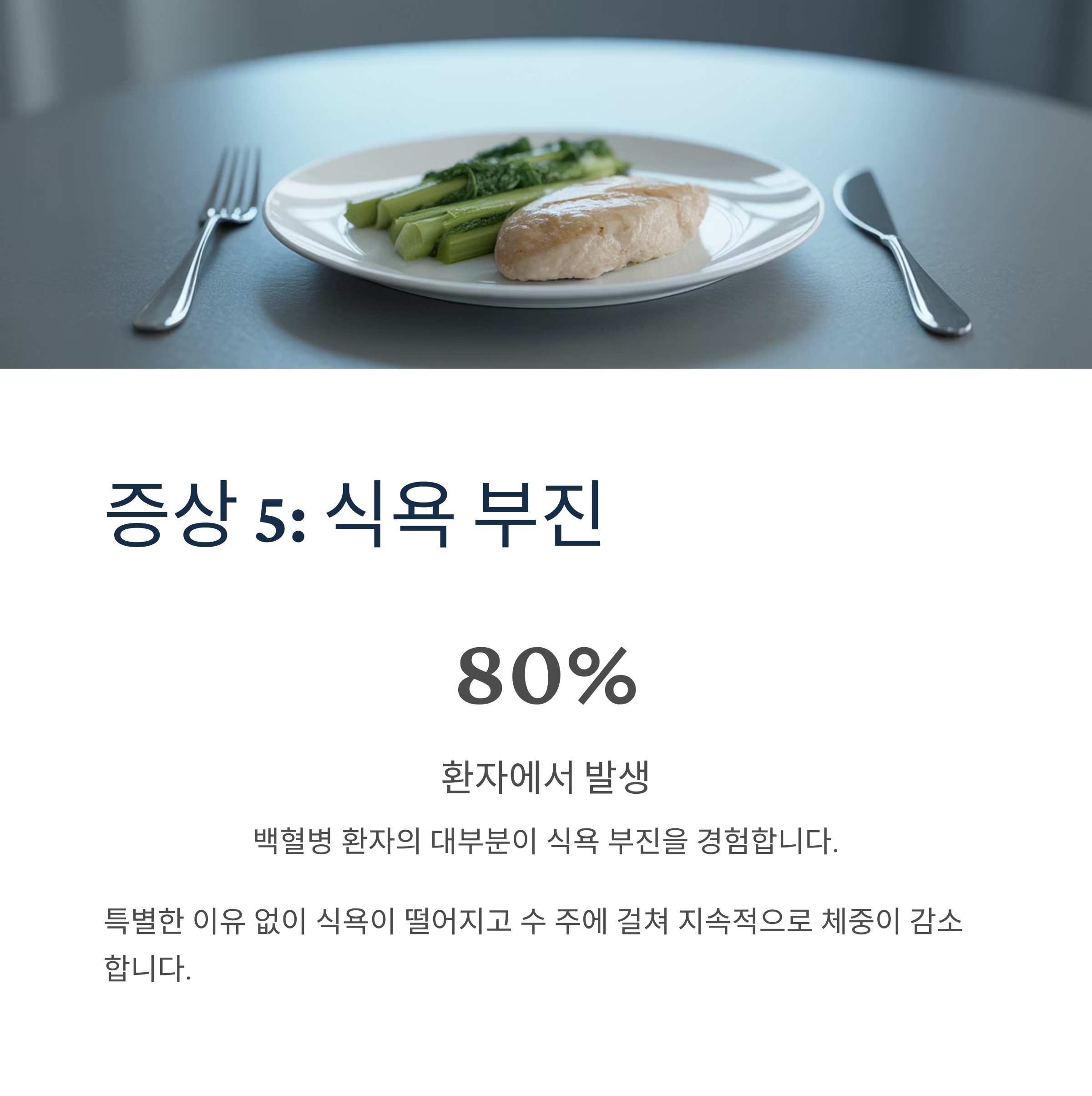 특별한 다이어트나 이유 없이 식욕이 떨어지고 체중이 감소합니다. 백혈병 환자의 80% 정도에서 식욕 부진 증상이 나타나며, 수 주에 걸쳐 지속적으로 체중이 줄어듭니다.