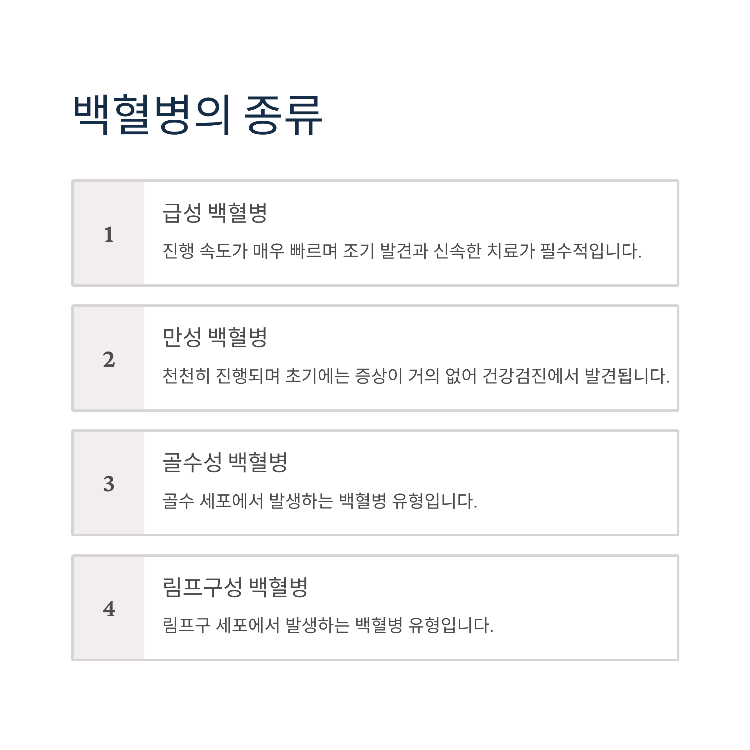 백혈병은 크게 급성 백혈병과 만성 백혈병으로 나뉘며, 암세포 변화 위치에 따라 골수성 백혈병과 림프구성 백혈병으로 구분됩니다. 급성 백혈병은 진행 속도가 매우 빠르기 때문에 조기 발견과 신속한 치료가 필수입니다.