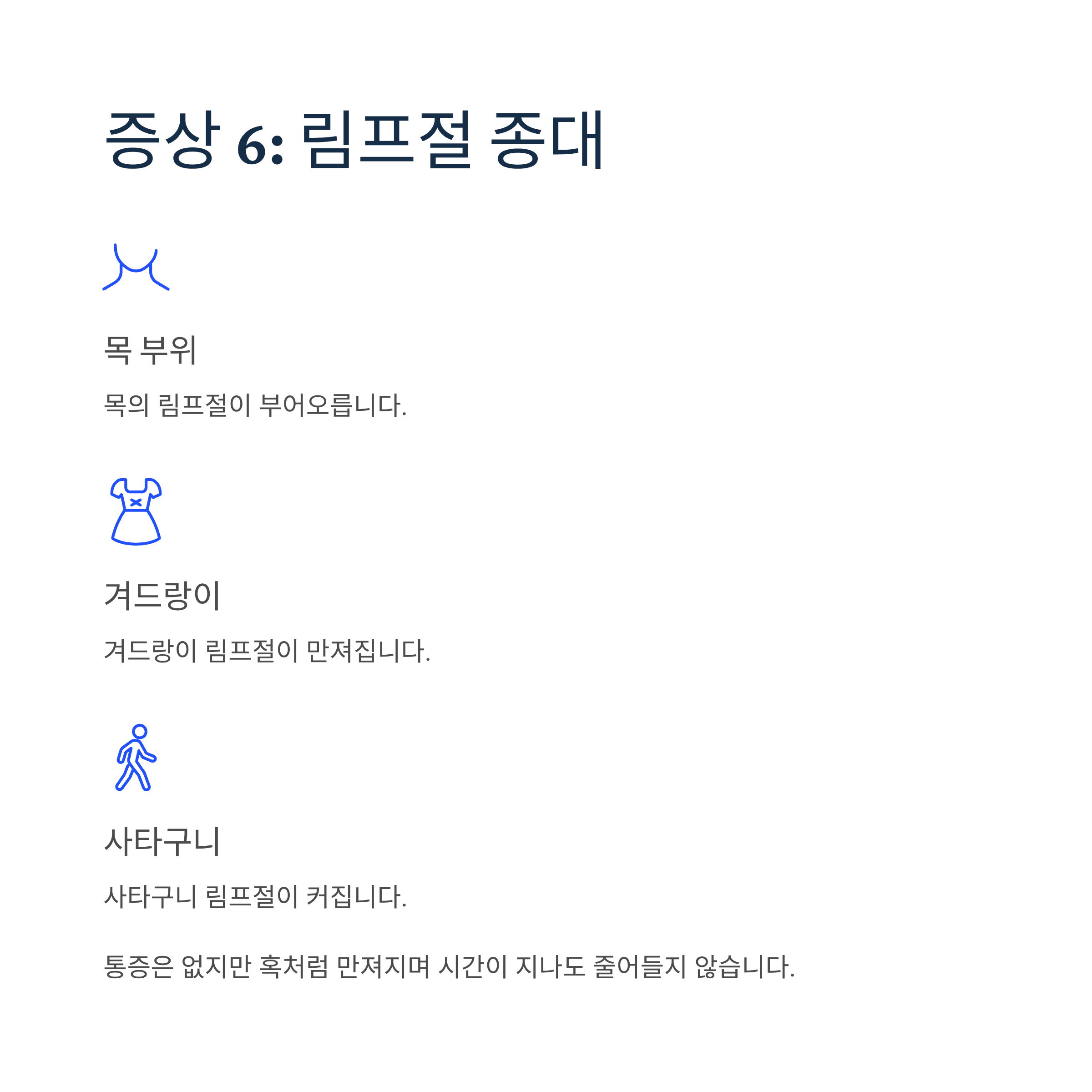 목, 겨드랑이, 사타구니 등의 림프절이 부어오르는 증상입니다. 통증은 없지만 만져지는 혹처럼 느껴지며, 시간이 지나도 줄어들지 않고 점차 커질 수 있습니다.