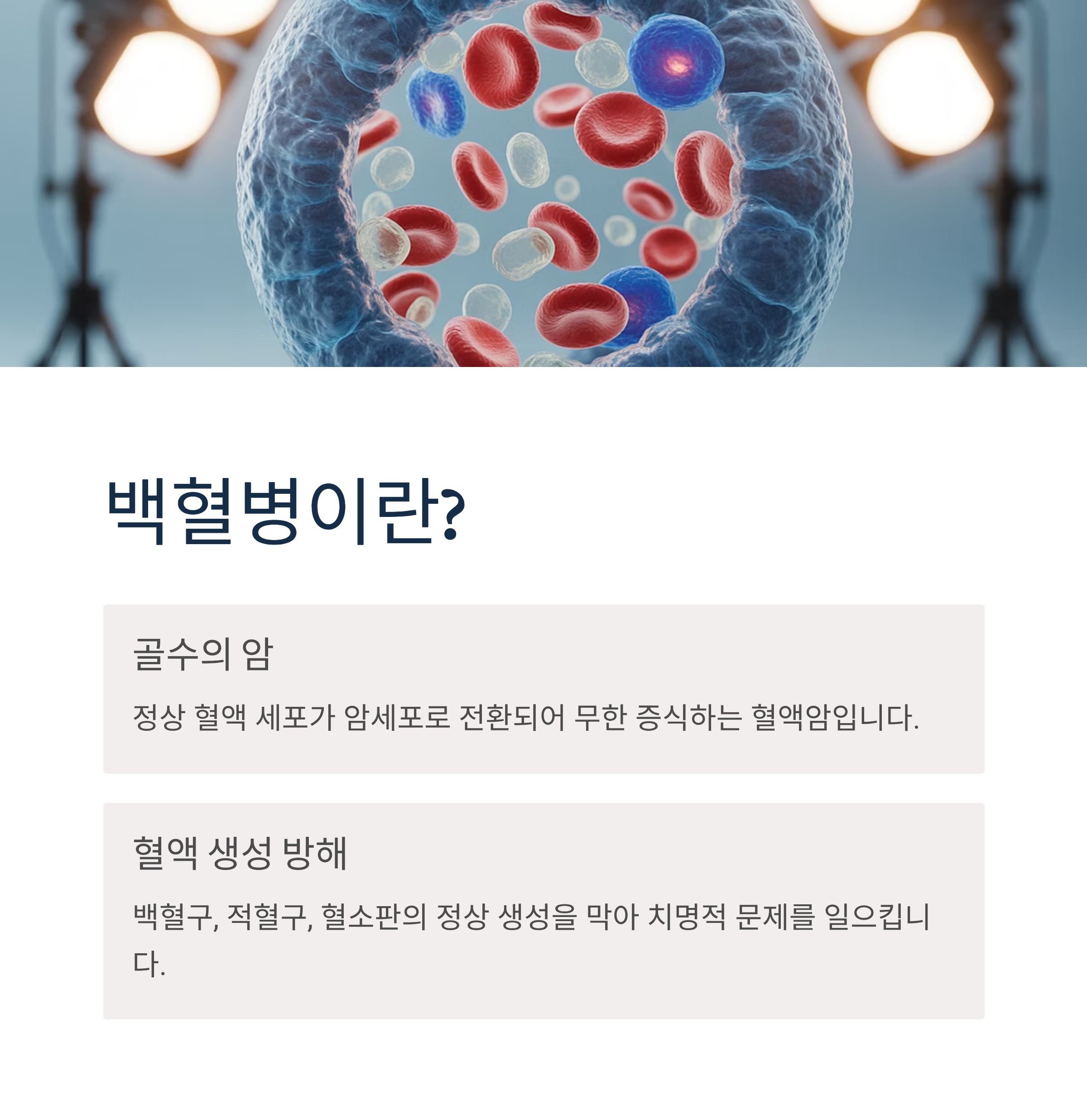 백혈병은 골수의 정상 혈액 세포가 암세포로 전환되어 무한 증식하는 혈액암입니다. 백혈병 세포는 정상적인 백혈구, 적혈구, 혈소판의 생성을 방해하여 신체에 치명적인 문제를 일으킵니다.