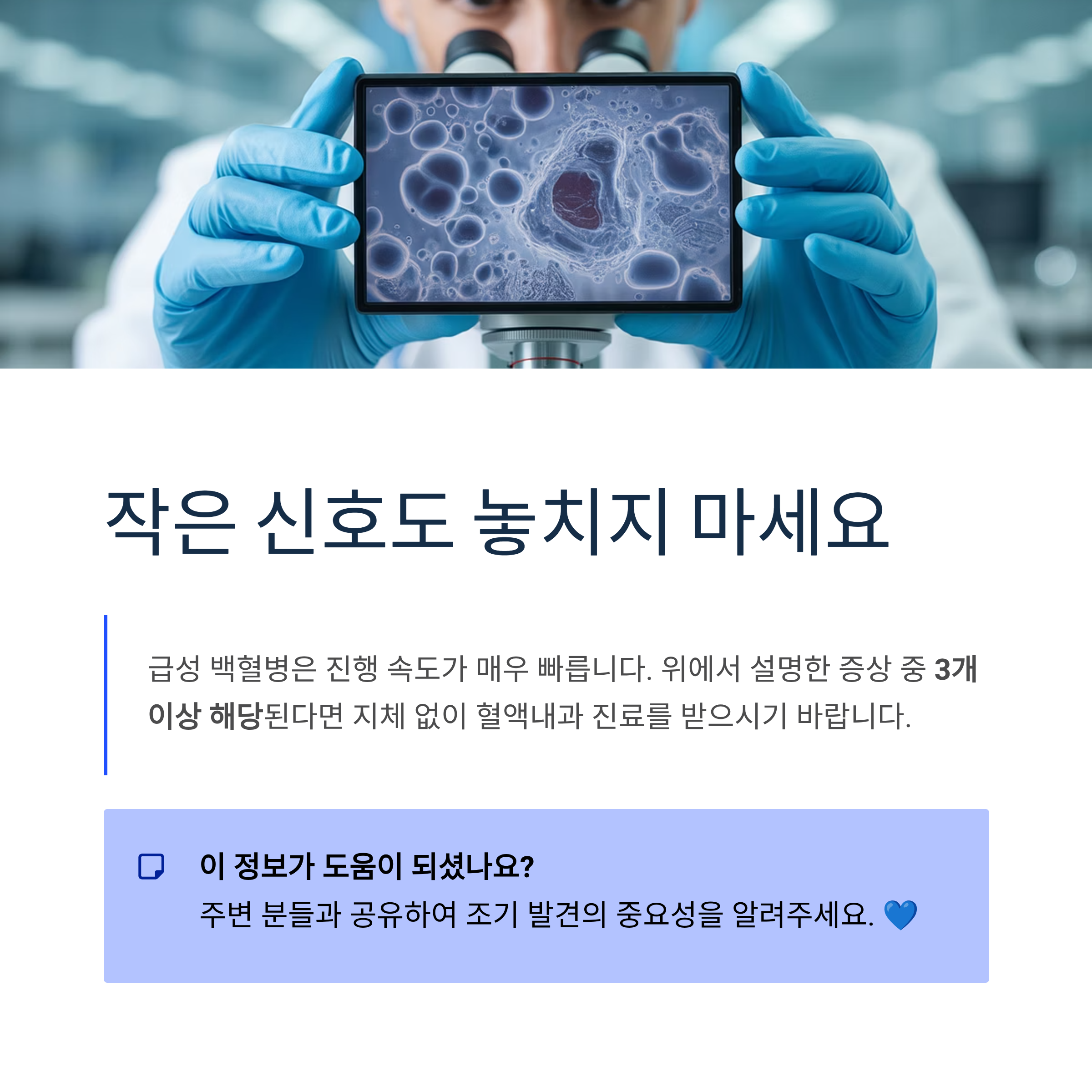 특히 급성 백혈병은 진행 속도가 매우 빠르므로, 위에서 설명한 증상 중 3개 이상 해당된다면 지체 없이 혈액내과 진료를 받으시기 바랍니다. 조기 발견이 생존율을 좌우하는 만큼, 작은 신호도 놓치지 마세요.